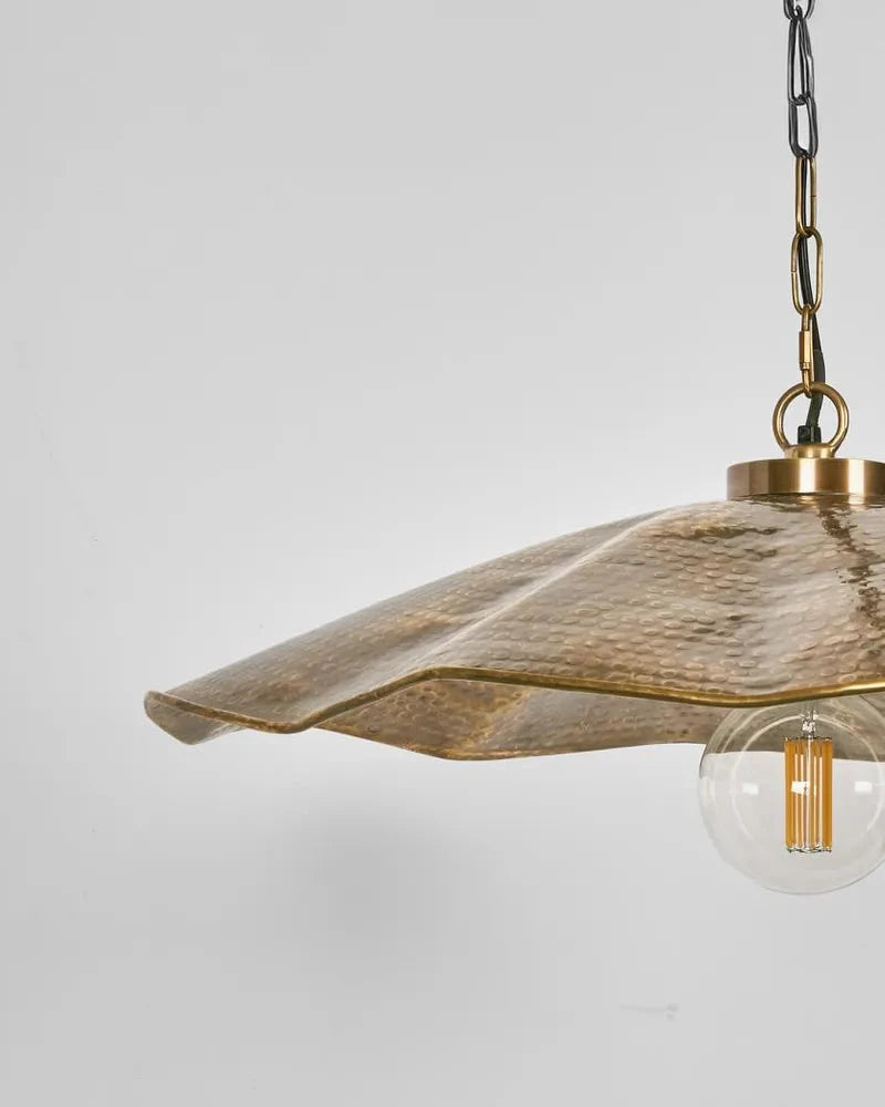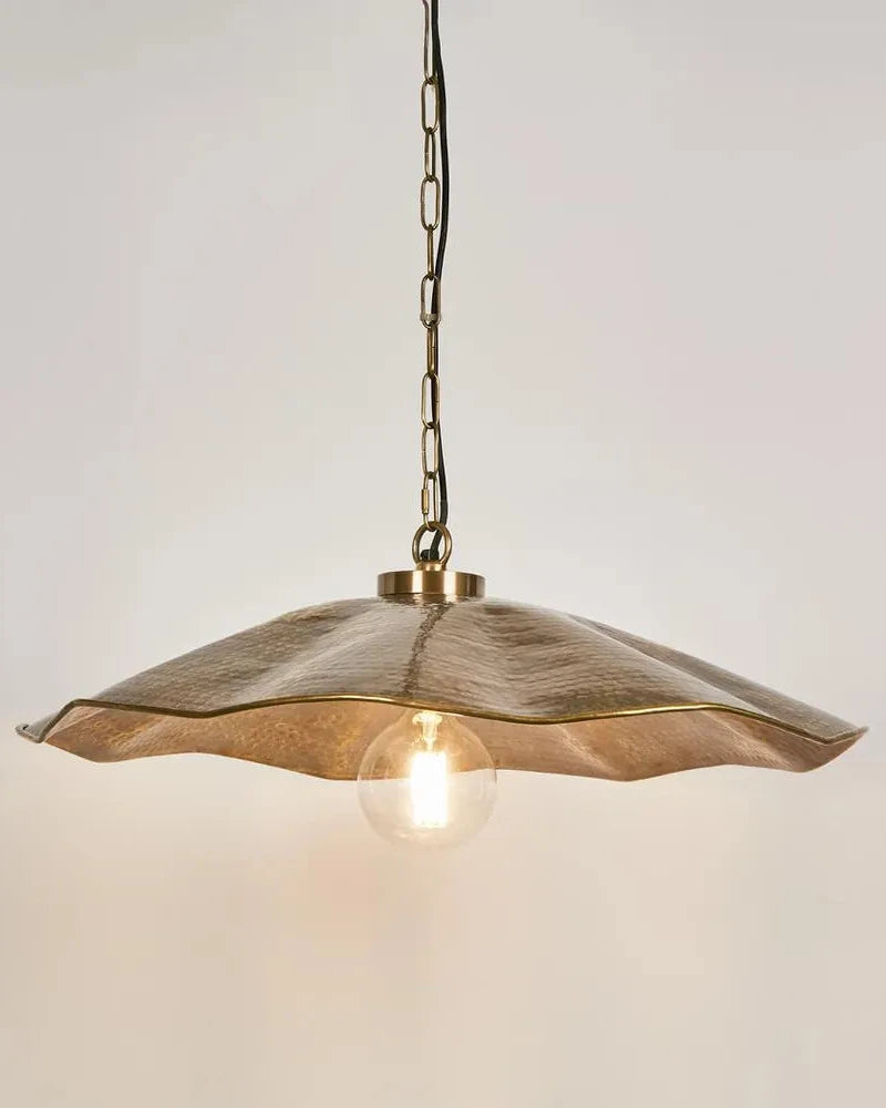 Featuring a hammered curved shade crafted from antique brass this large pendant will become a striking focal point within any interior with its 990mm width. With the combination of its large size and hammered detailing this design is particularly suited for suspension over a dining room table or in a large foyer to add a rustic farmhouse touch.
