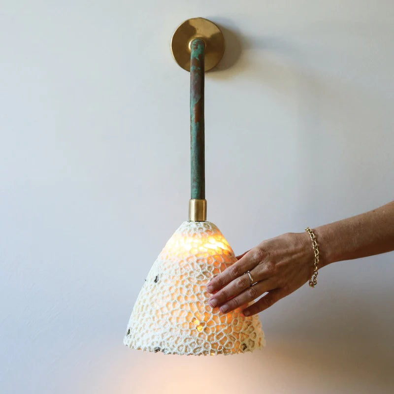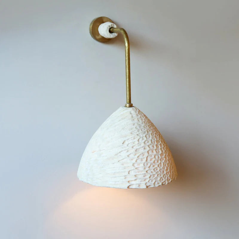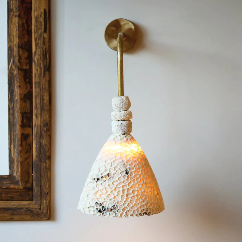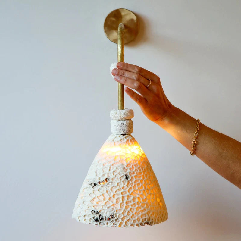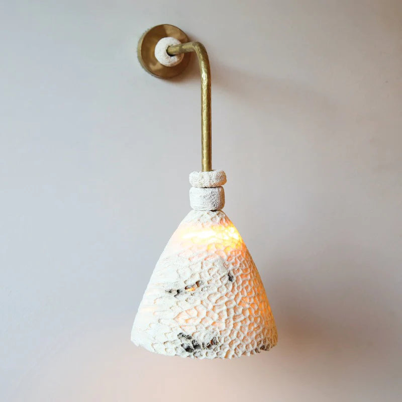 Introducing the Marovo Island Traders' Fossil Coral Arc Cone Wall Light - a celebration of nature's beauty and sacred geometry - exploring the ancient wonder of texture, pattern and light. Crafted from Fossil Coral, a natural stone sculpted over countless years and sustainably sourced from the Solomon Islands. This collection embodies the authenticity of coastal living, casting a warm and inviting glow to interiors. Illuminate your space with this collection and embark on a journey that speaks to the timeless beauty of the natural world.