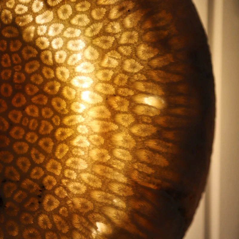 Discover Marovo Island Traders' Fossil Coral Moon Wall Light, a homage to nature's serene beauty. Made from Fossil Coral, a unique natural stone formed over millions of years, these wall lights bring a touch of rustic elegance to any space. Marovo sustainably sources only the finest Fossil Coral from the Solomon Islands to ensure nature's craftsmanship shines through with every piece. Each wall light showcases variations of the stone's authentic character for a truly organic addition. Beyond its aesthetics, Fossil Coral is a reminder of the planet's fascinating geological history, once a part of ancient coral reefs, now fossilised. The collection speaks to the authenticity of coastal living, illuminating your surroundings with a warm inviting glow.