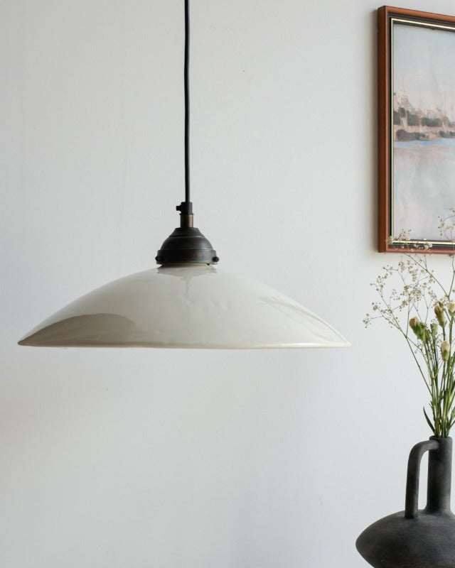 This exquisite ceramic pendant light adds a touch of sophistication to your living or working space. Its timeless design includes a ceramic shade and antique brass top fitting, complemented by a matching cup ceiling rose. Suitable for placement above a kitchen island or dining table, this light comes in a single off-white/cream colour option, with both small and large sizes available.