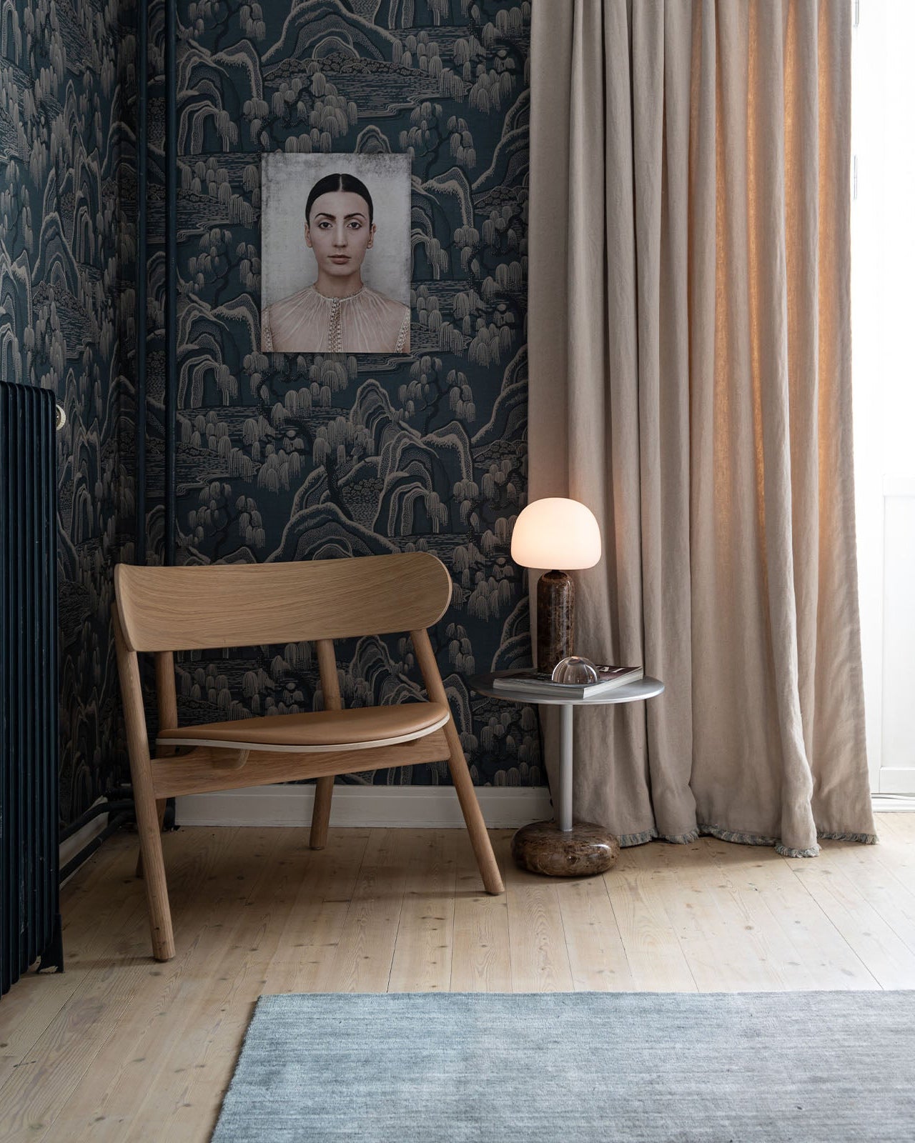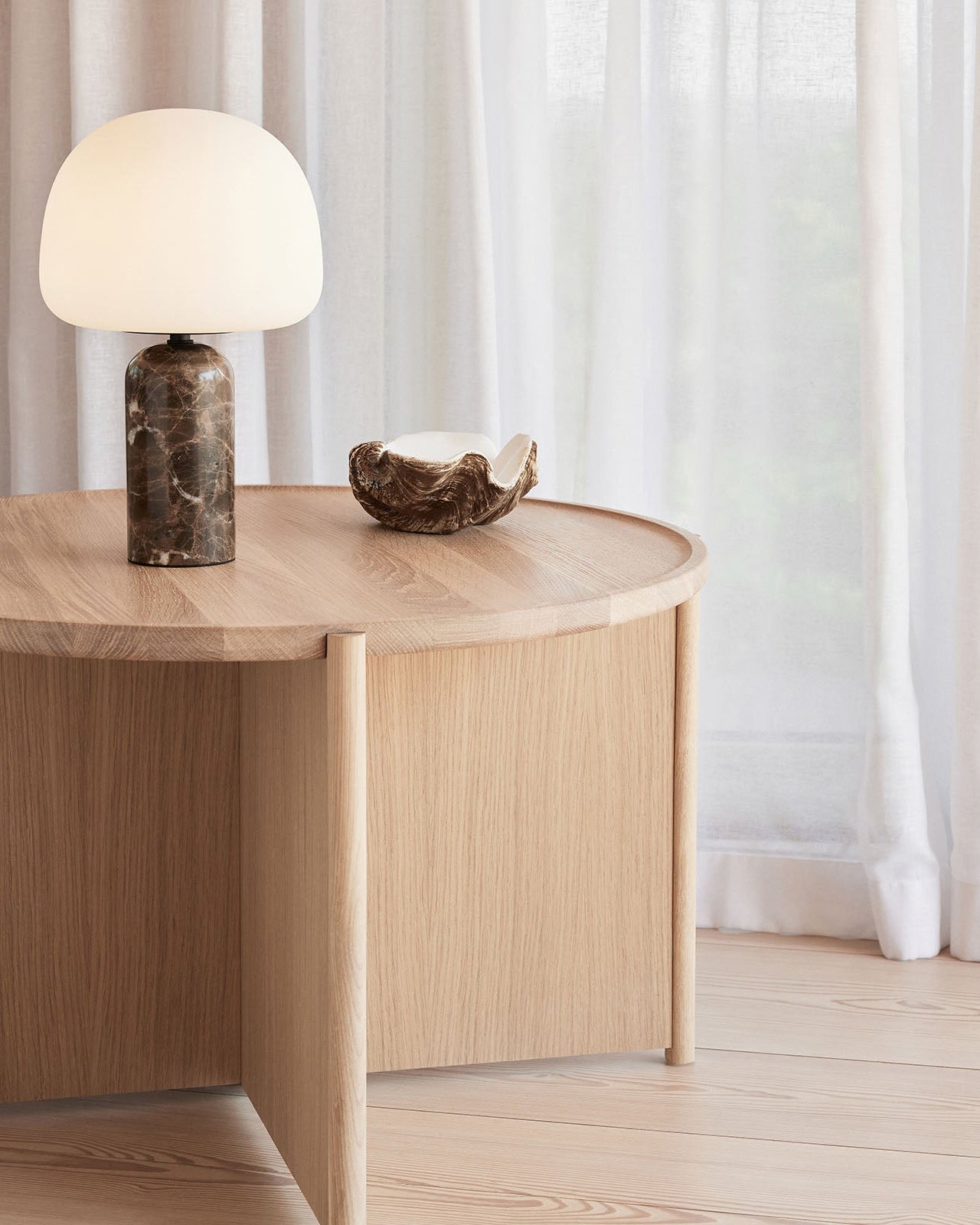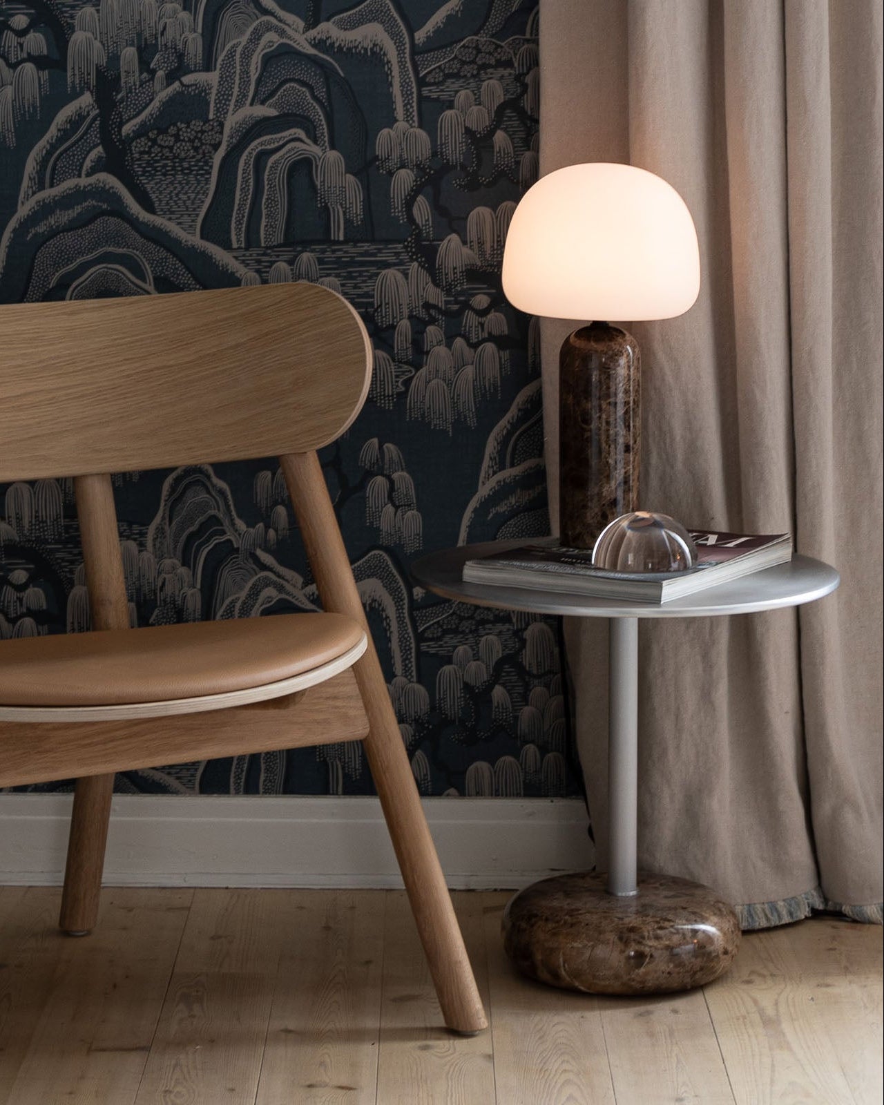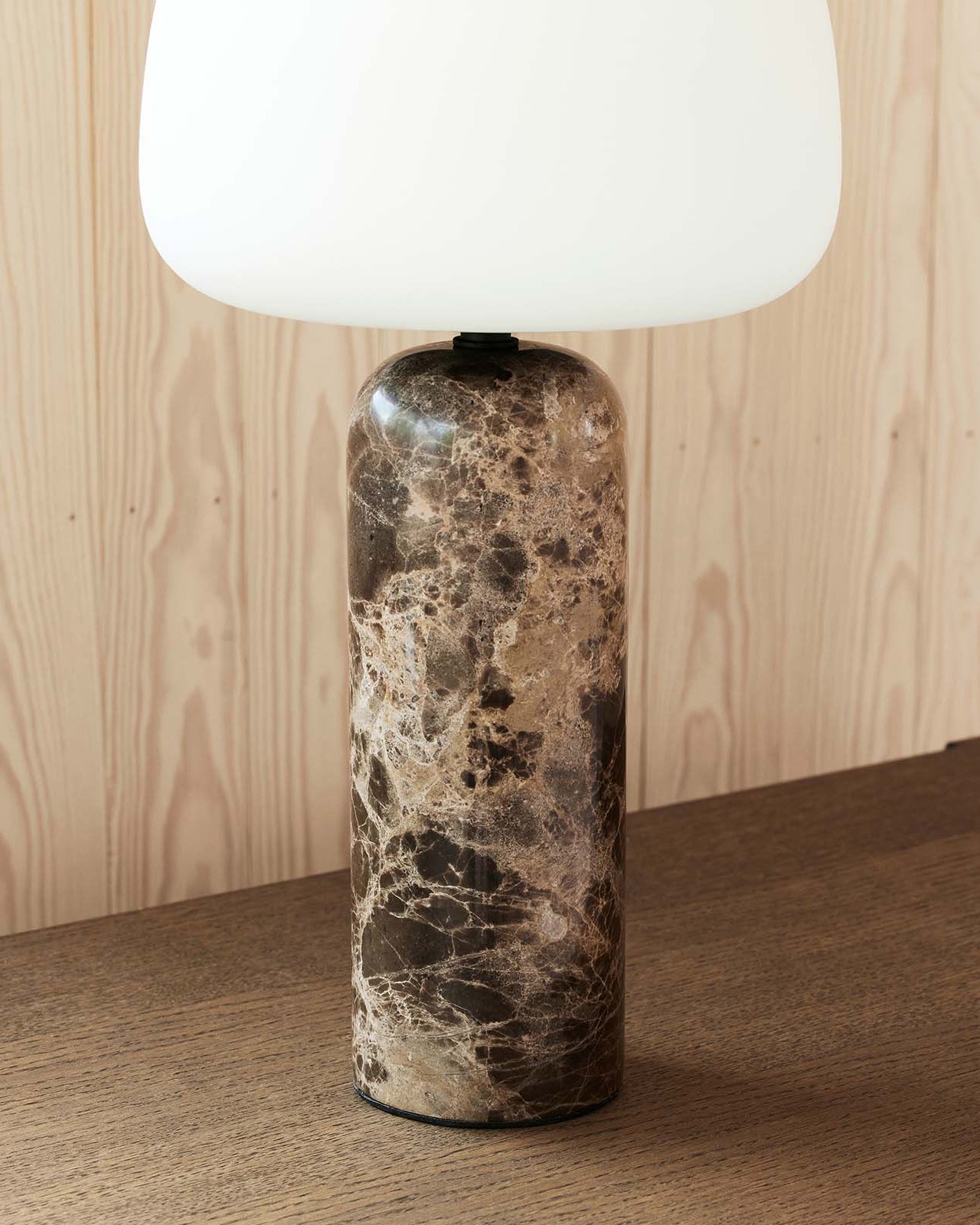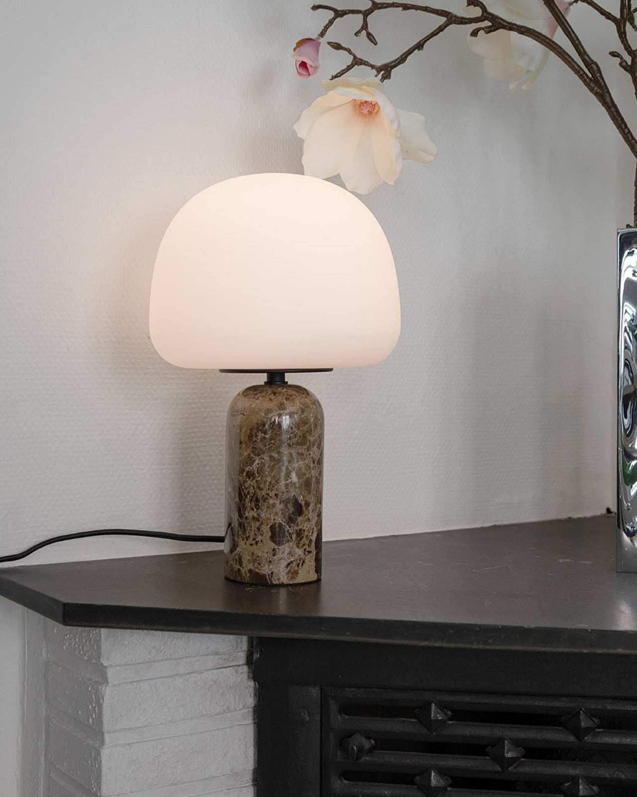 This table lamp is a unique creation by the renowned Norwegian duo Morten & Jonas. It features premium materials and finishes, including a large oversized mouth-blown opal glass shade and a polished Emperador marble brown base that creates a soft mushroom-like impression. The lamp is versatile and available in two bold sizes. It also includes a small hand dimmer that is discreetly in the cable, allowing you to adjust the light as required. Ideal to enhance dining areas or as an ambient bedside lamp.