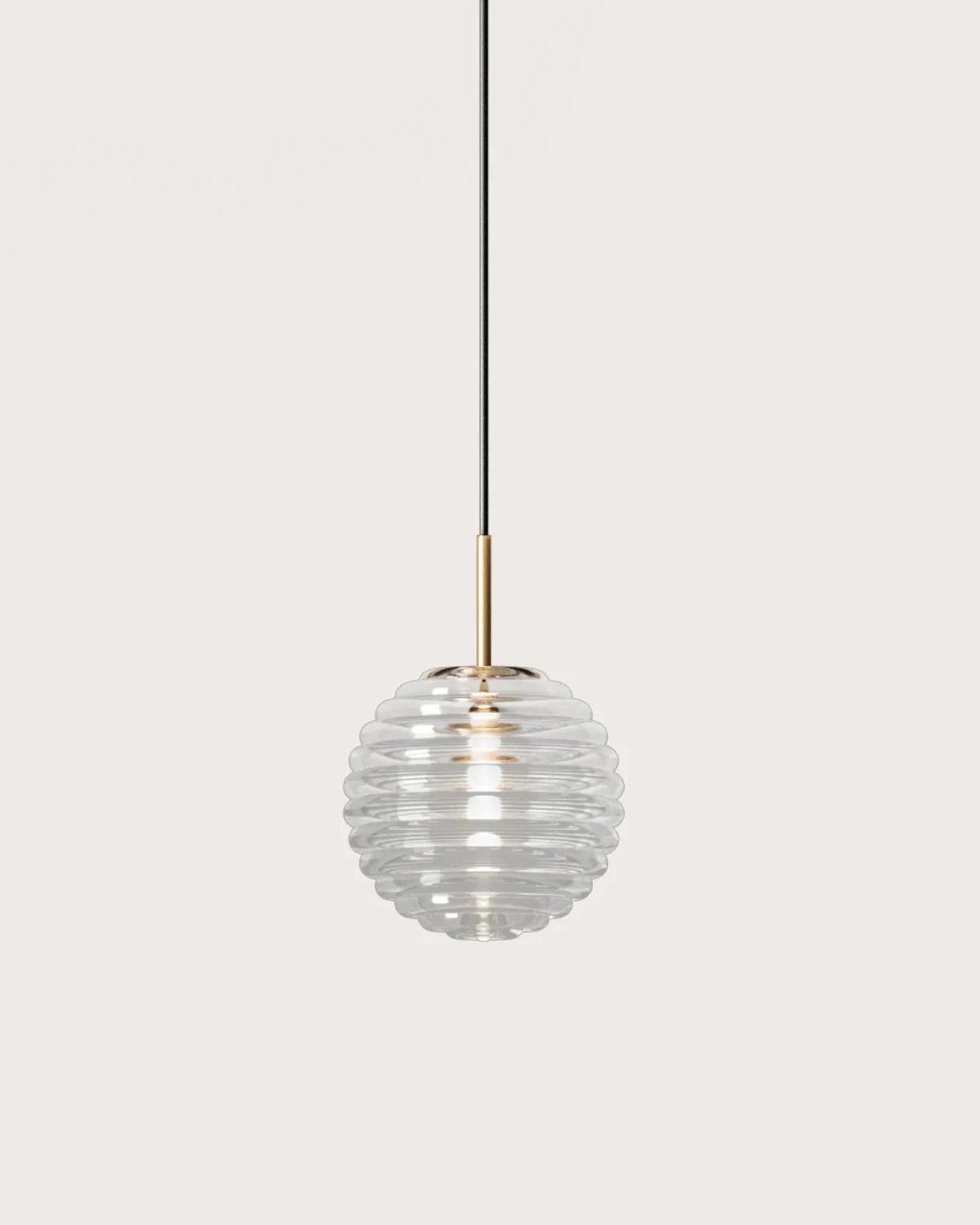 Pendant light with ribbed glass shade on a white background