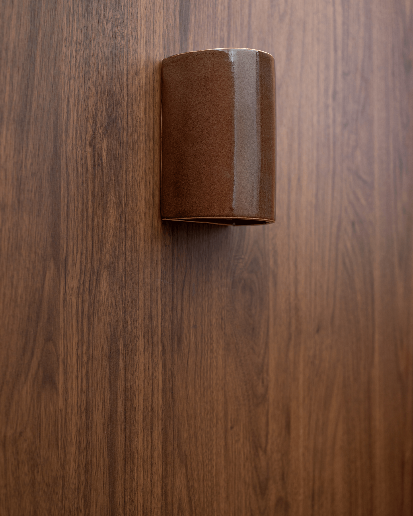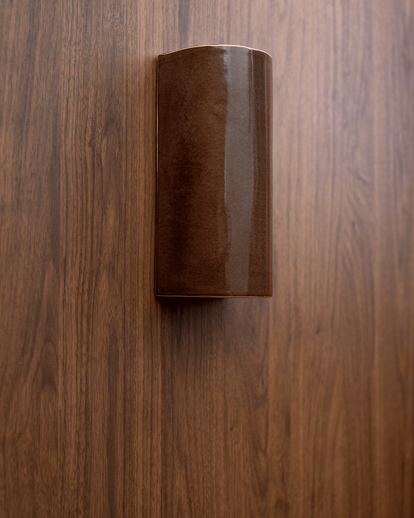 Its distinctive ceramic form features a smooth, tactile surface with subtle glaze detailing that reflects craftsmanship and individuality. Mounted on a discreet custom back plate, the fitting sits close to the wall, creating a refined, architectural presence.