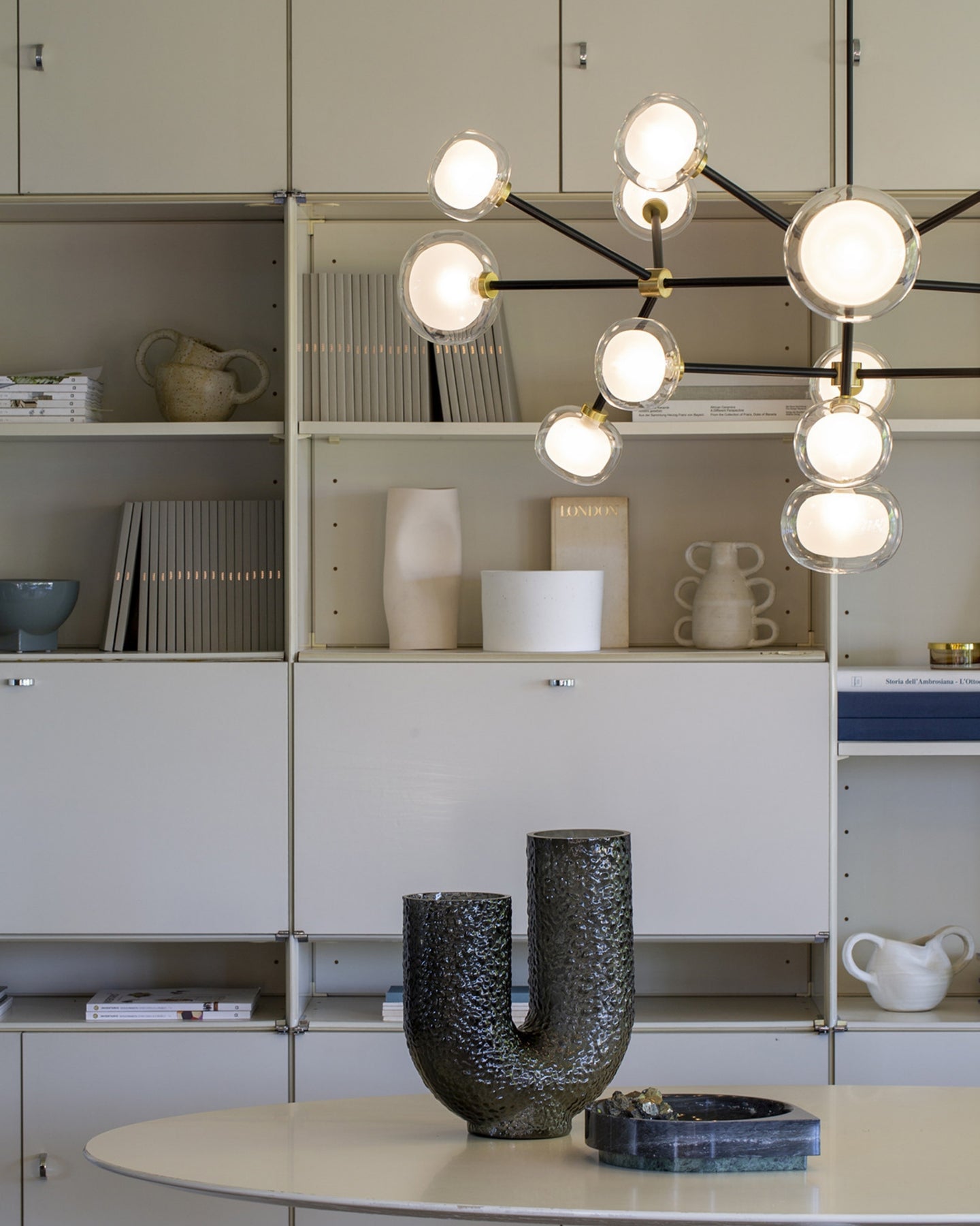 The Layered Glass Chandelier merges mid-century design principles with modern aesthetics through its striking architectural form. Comprising of 9, 10, 12, or 16 double-walled borosilicate glass spheres suspended from a metal frame, this fitting delivers both visual aesthetics and functional illumination. Available with brass or black chrome finishes, this statement piece creates a floating, sculptural presence ideal for expansive living spaces, formal dining rooms, and grand foyers.