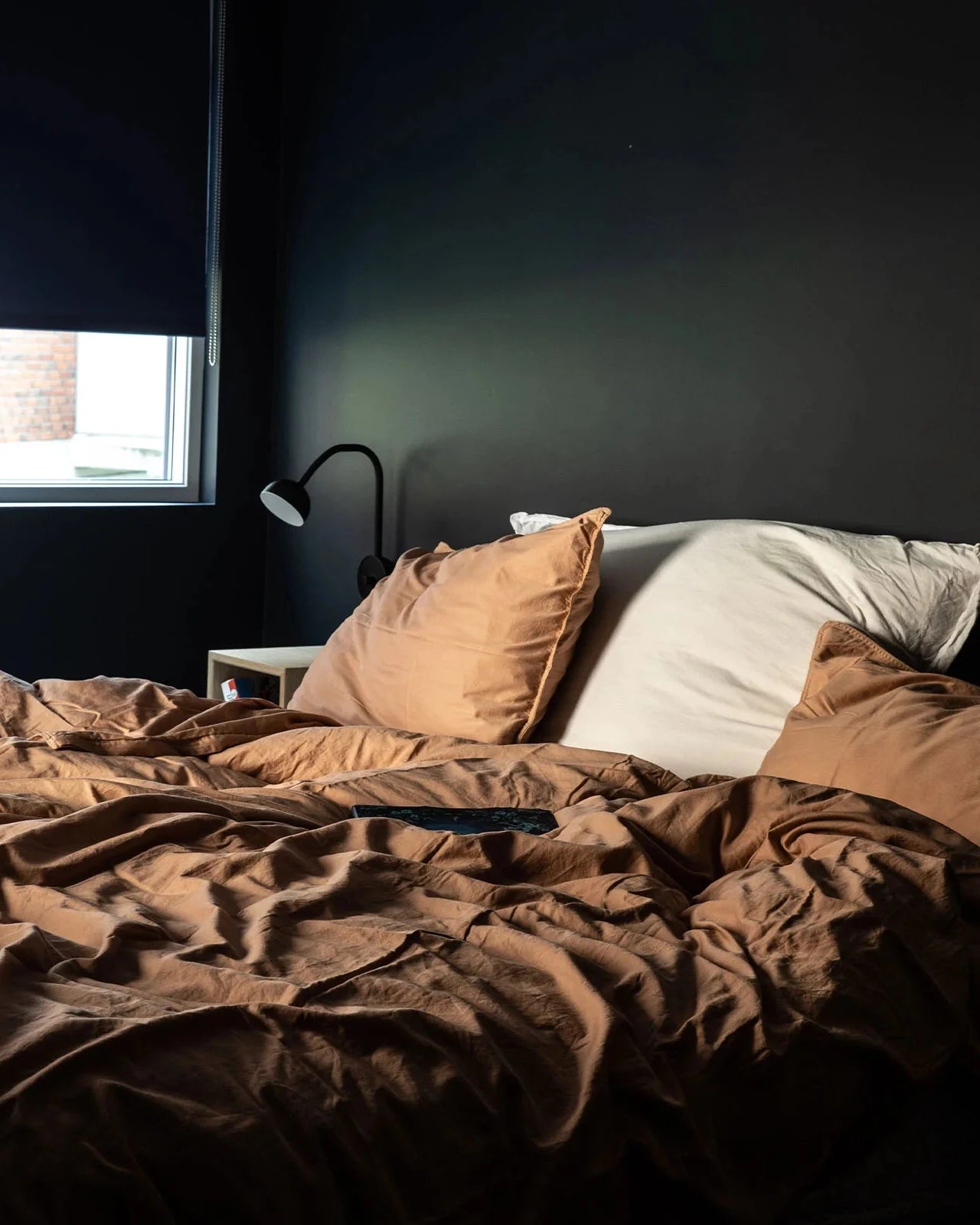 Bed with brown bedding and pillows in a dimly lit room and Scandinavian Adjustable Wall Lamp in Black