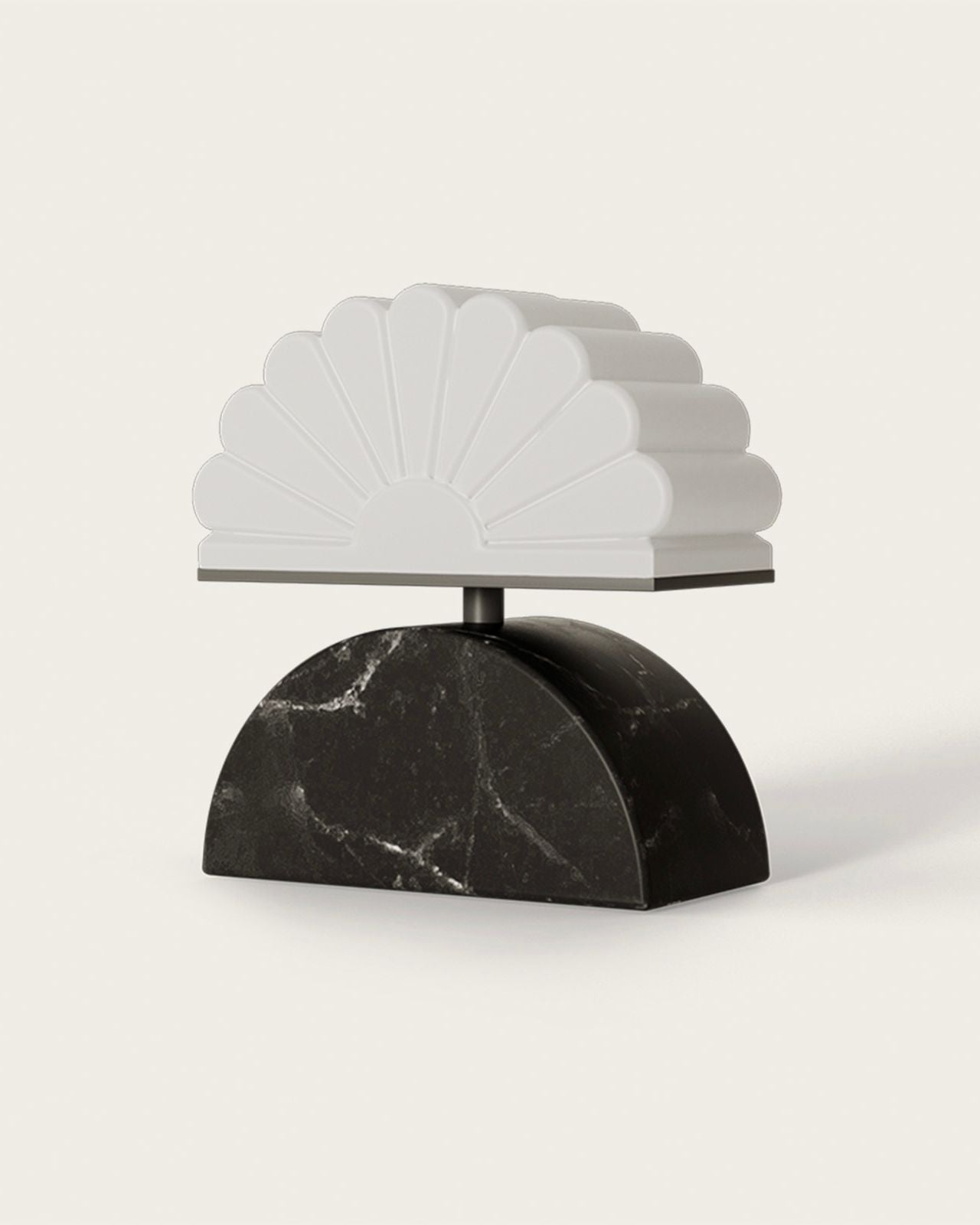 The Semi-Circular Scalloped Table Lamp features a marble base with white veining, giving it a luxurious and grounded appearance. The lamp’s diffuser is a scallop-shaped design made of opaque white glass, designed to emit a soft, ambient glow. The diffuser sits atop a slim metal stem, which connects it to the base, adding a subtle industrial contrast. The combination of geometric solidity and delicate detailing gives this piece a refined modern and classic aesthetic, making it an ideal statement accessory for Art Deco-inspired interiors.