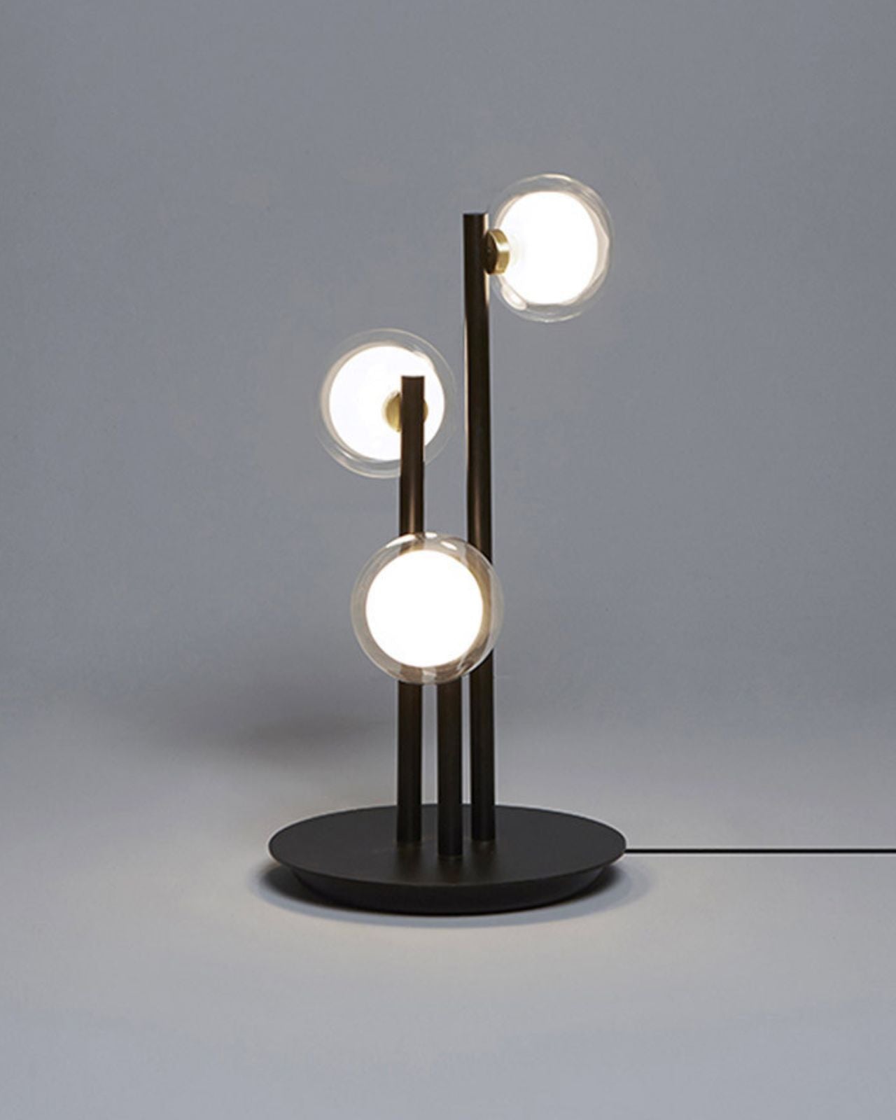 The Layered Glass Triple Table Lamp features a 50s-inspired silhouette offering both functional lighting and moody atmospheric glow. The fitting blends mid-century elegance featuring a frosted diffuser encased in a Clear or Smoke glass shade with a Black Chrome or Brushed Brass detailing. The contemporary refinement is ideal for living rooms, bedrooms, or stylish workspaces.