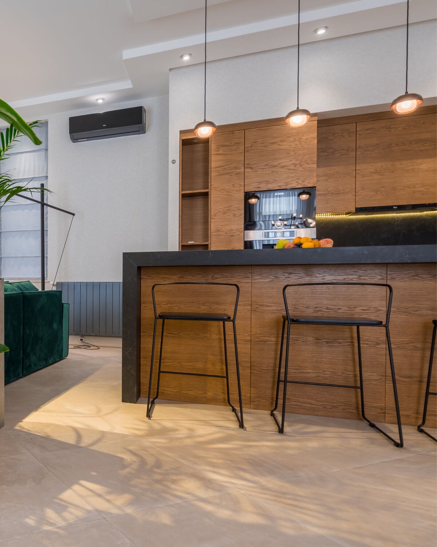 Modern kitchen with three hanging pendants, wooden cabinets, black countertop, and bar stools.