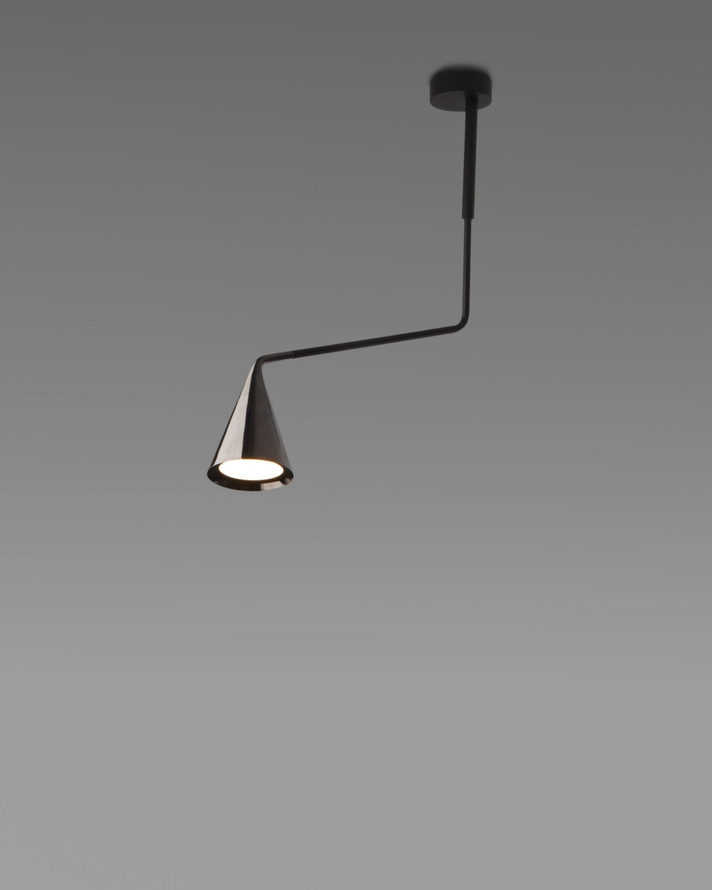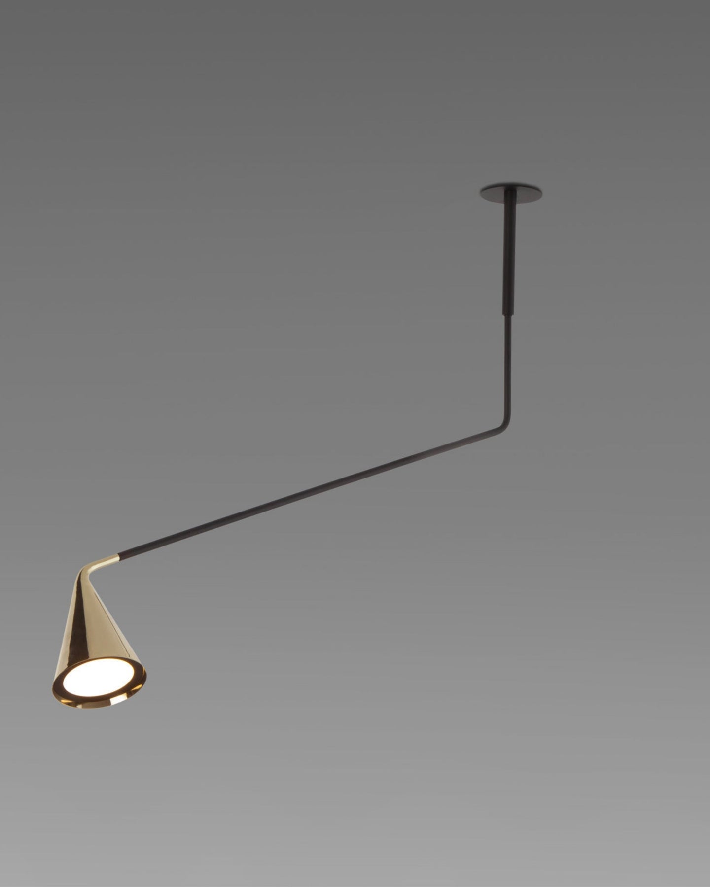 Modern pendant light with black arm and cone-shaped shade on a gray background