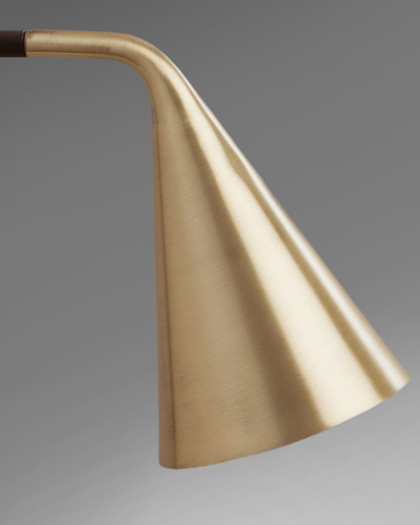 Modern pendant light with black arm and gold lampshade on a gray background