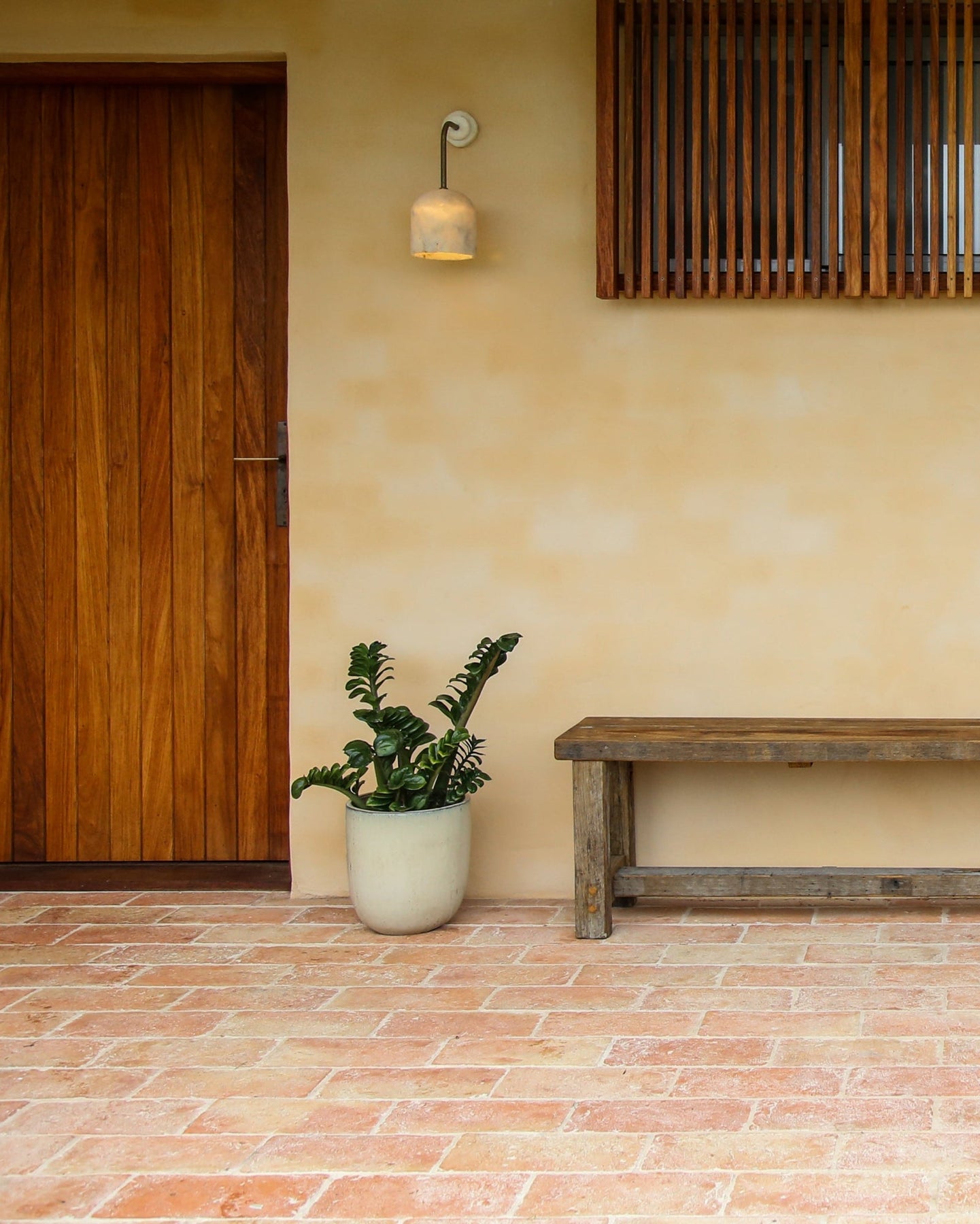 Three wall-mounted lights on a mustard wall with a wooden bench below.