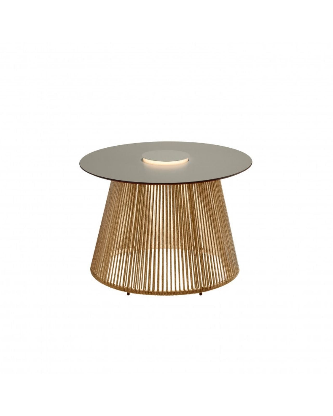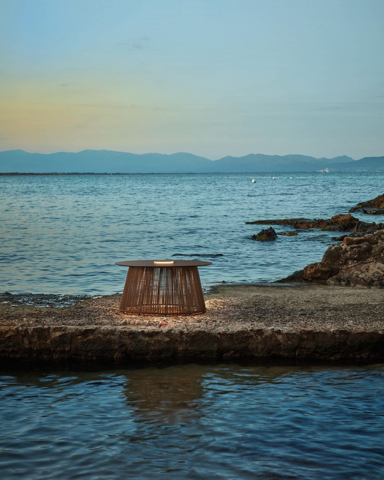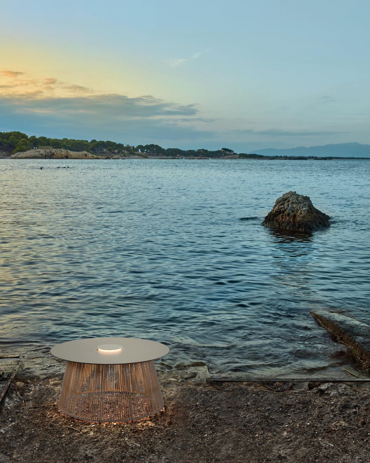 The Mediterranean Woven Floor Lamp is a stylish portable lamp, made from an aluminium frame and nautical cord details. Designed with convenience in mind, this battery-powered lamp acts as a table with a removable LED in the centre of the tabletop. This lamp is ideal for outdoor gatherings, featuring three dimming options, illuminating whatever is placed on the table, and shining through the cord that decorates the base. Available in three unique finishes.