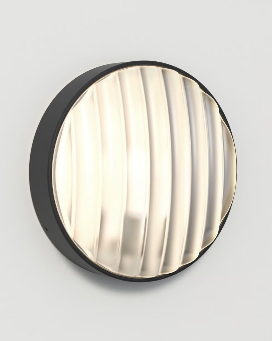 This bunker-style light showcases a modern industrial design. Paired with a sand-blasted wide-ribbed glass diffuser and finished in a textured black, this wall light is ideal for illuminating exterior pathways, garage walls or outdoor entertainment areas.  Available in a 220mm and 300mm diameter option.
