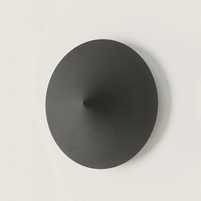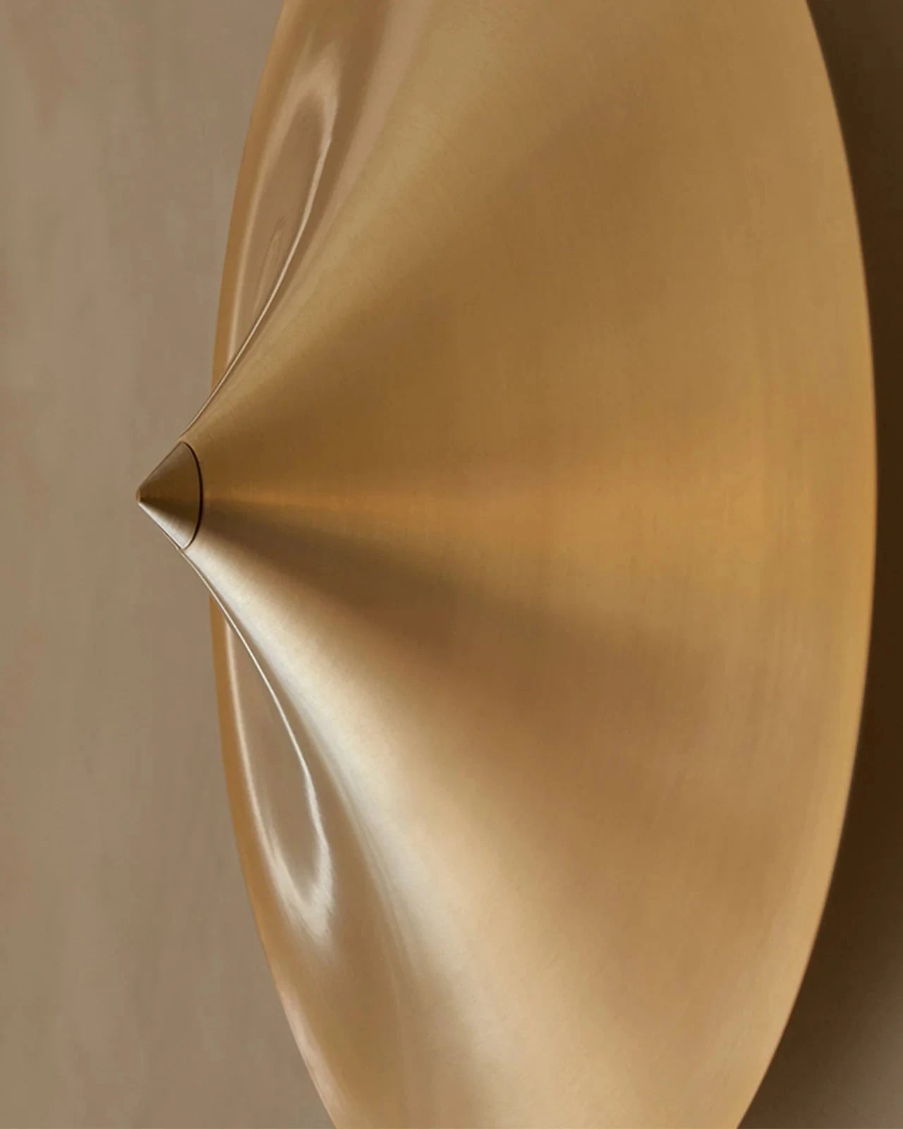 Made from steel and finished in either a Matte Brass or Black finish this cymbal-like circular wall light will bring a simplistic yet striking design feature to interior spaces. With a central raised point and smooth shape, this steel wall light is designed to be installed singularly or as a pair.