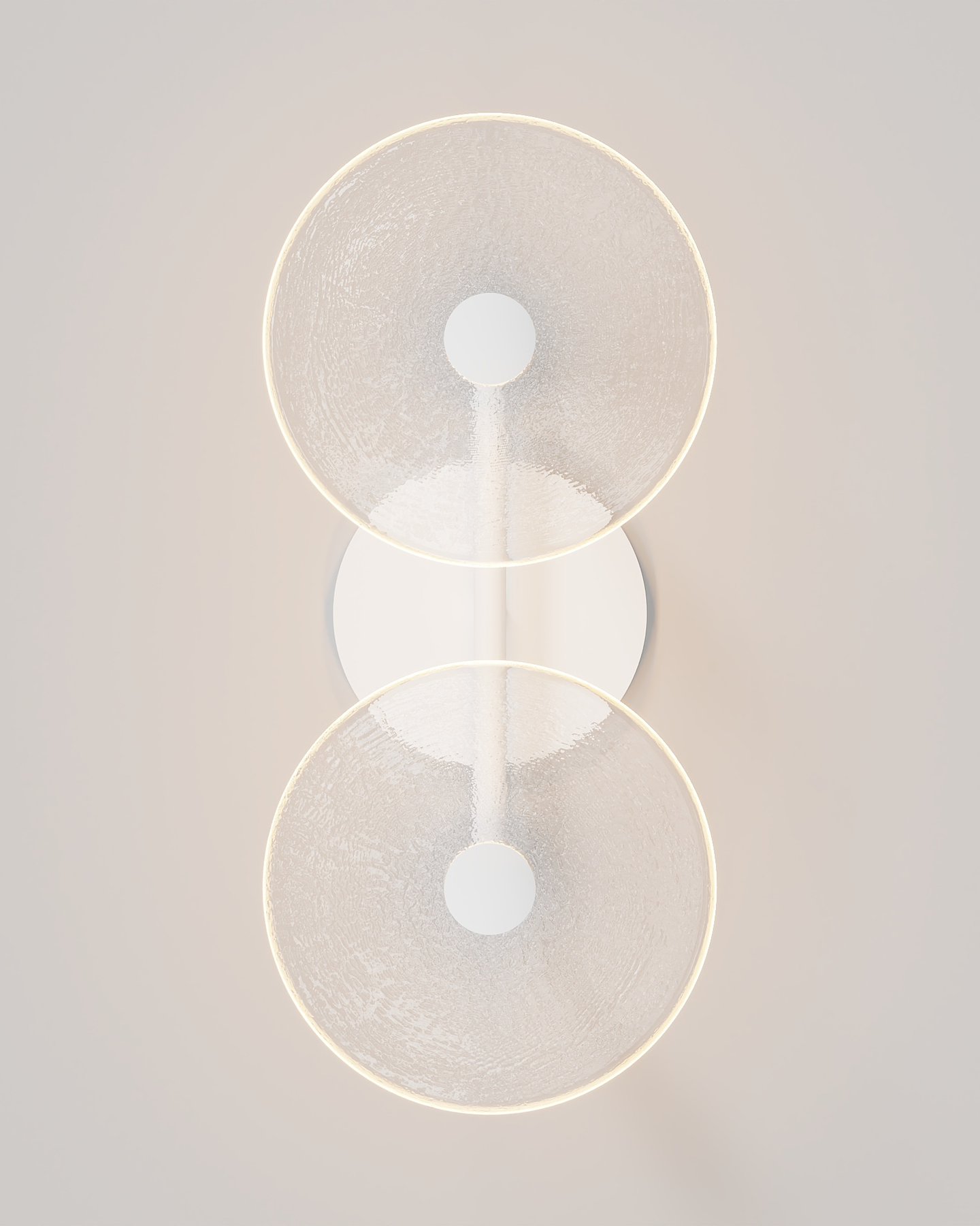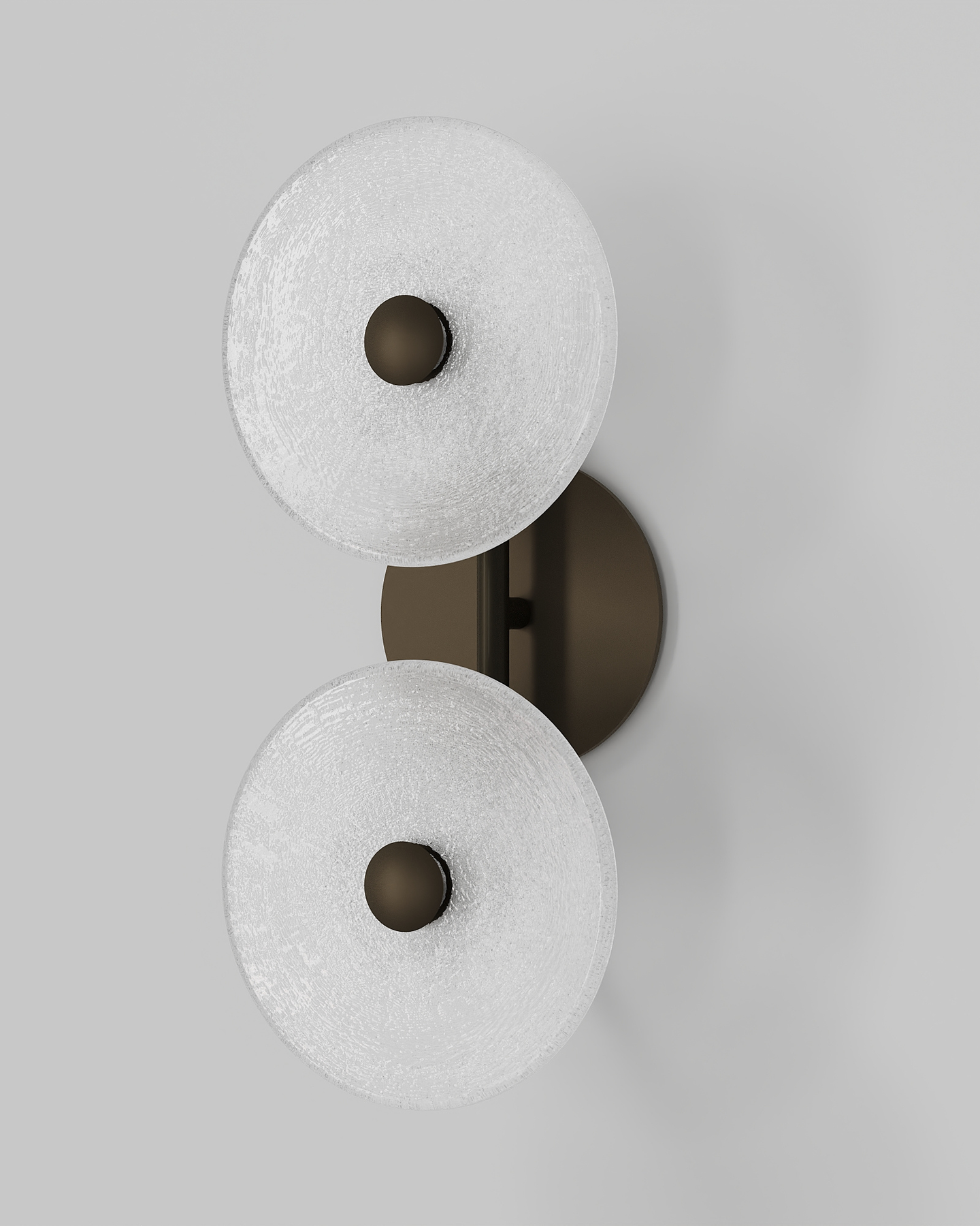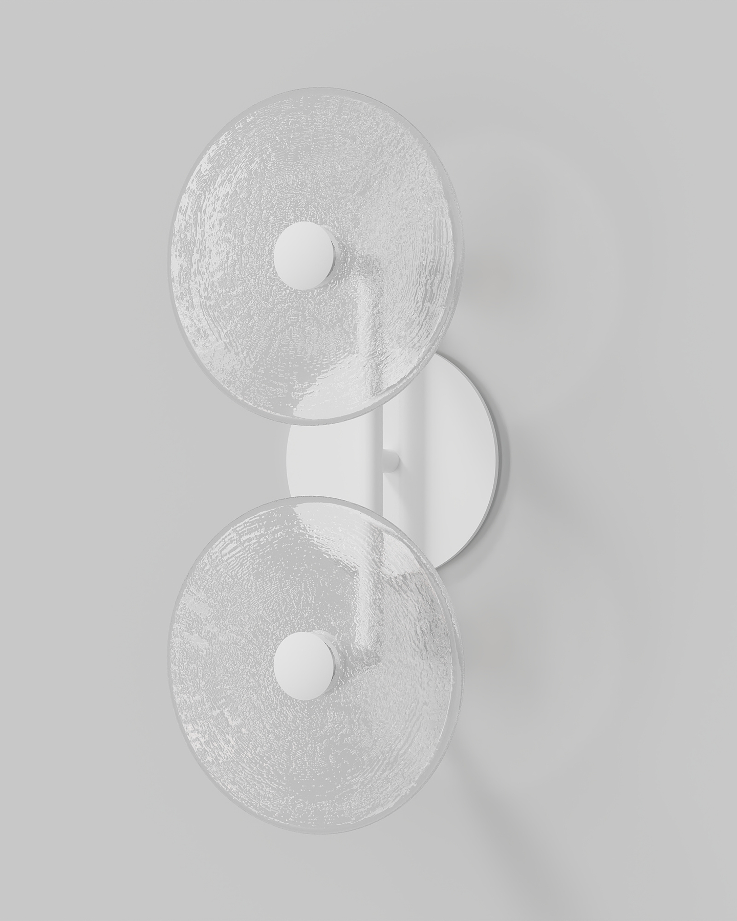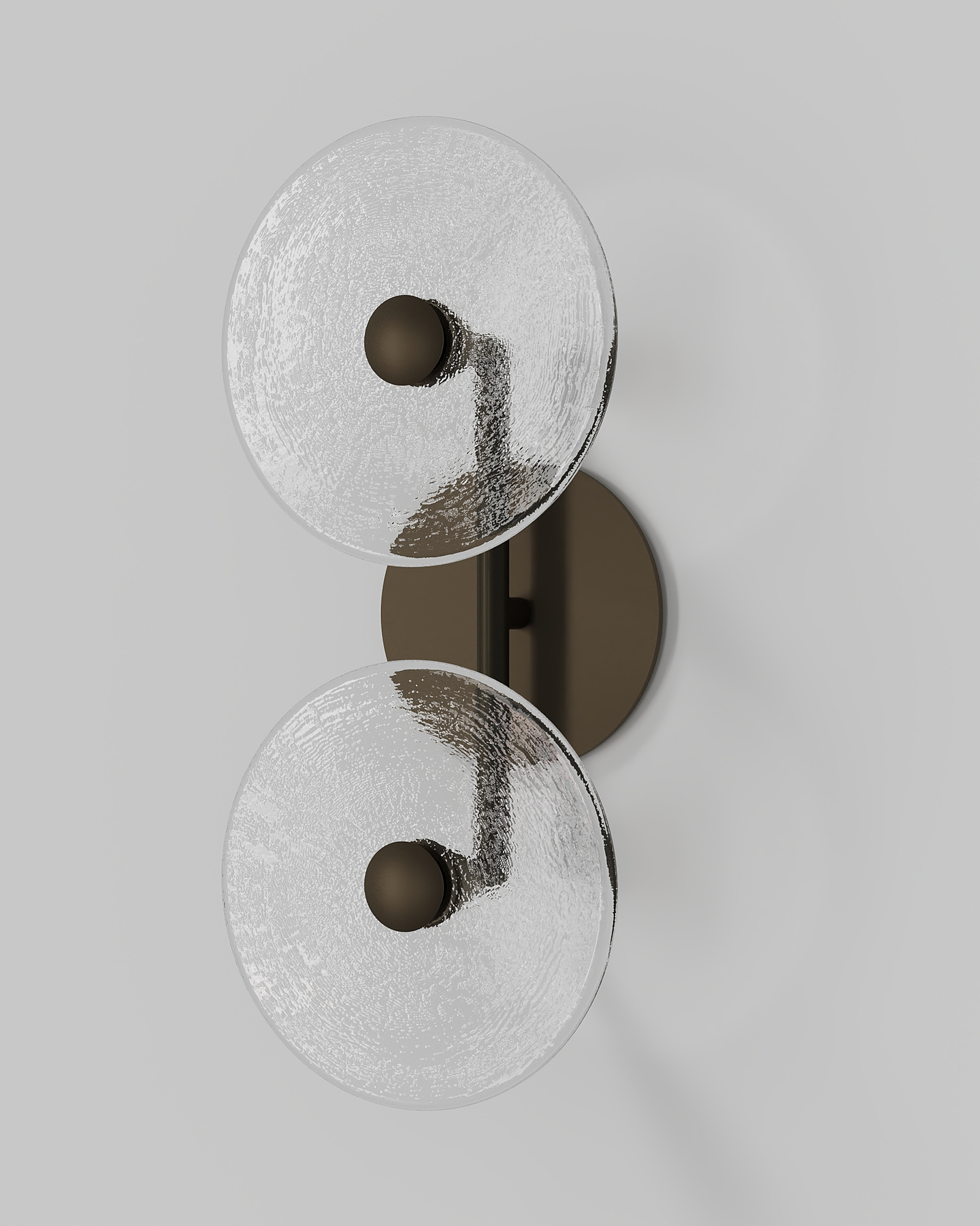 The Coral Duo Rod Wall Light, crafted and designed in Currumbin, Australia is a unique fitting made from two glass discs, mounted perpendicularly to a sleek rod. Available in Brass, Matte White, Matte Black, Steel and Medium Bronze, this fitting is versatile and suitable for a variety of contemporary interiors. Install a frosted glass fitting above a bedside table for a soft diffused light, or use the clear glass versions in clusters in a hallway for a more direct light.