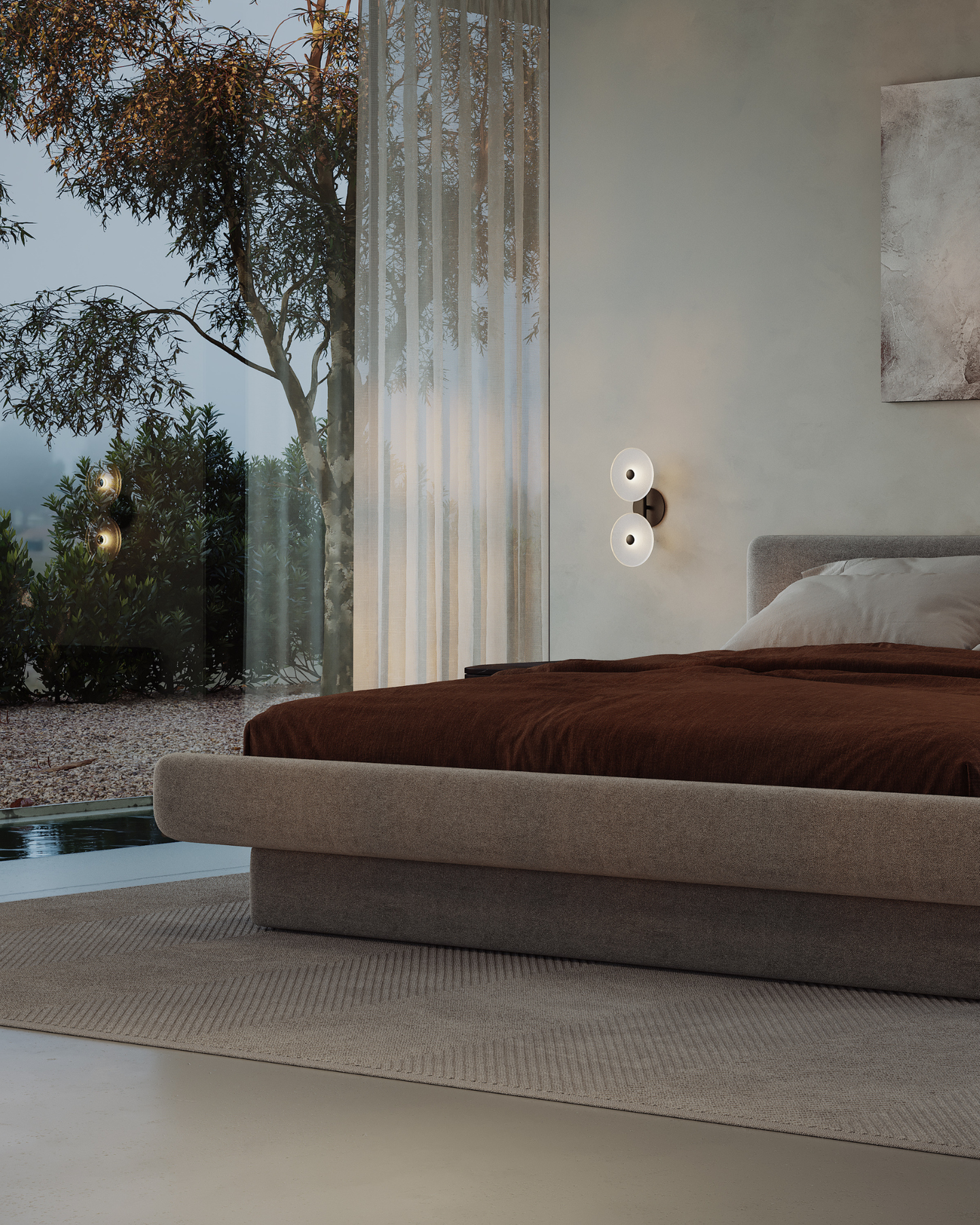 Modern bedroom with a bed, Coral Duo wall light, and outdoor view.