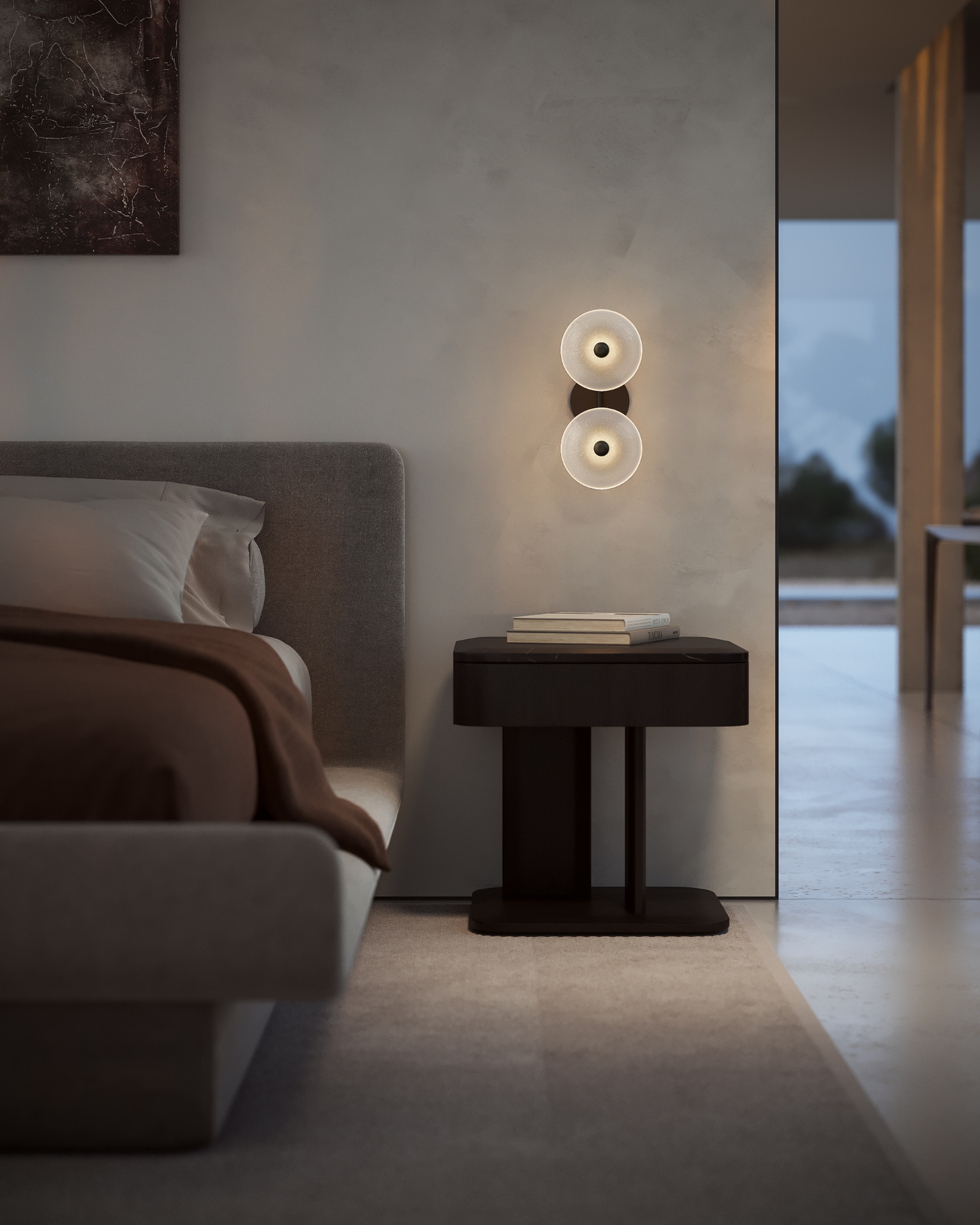 Modern bedroom with a bedside table and a Soktas Coral Duo wall light