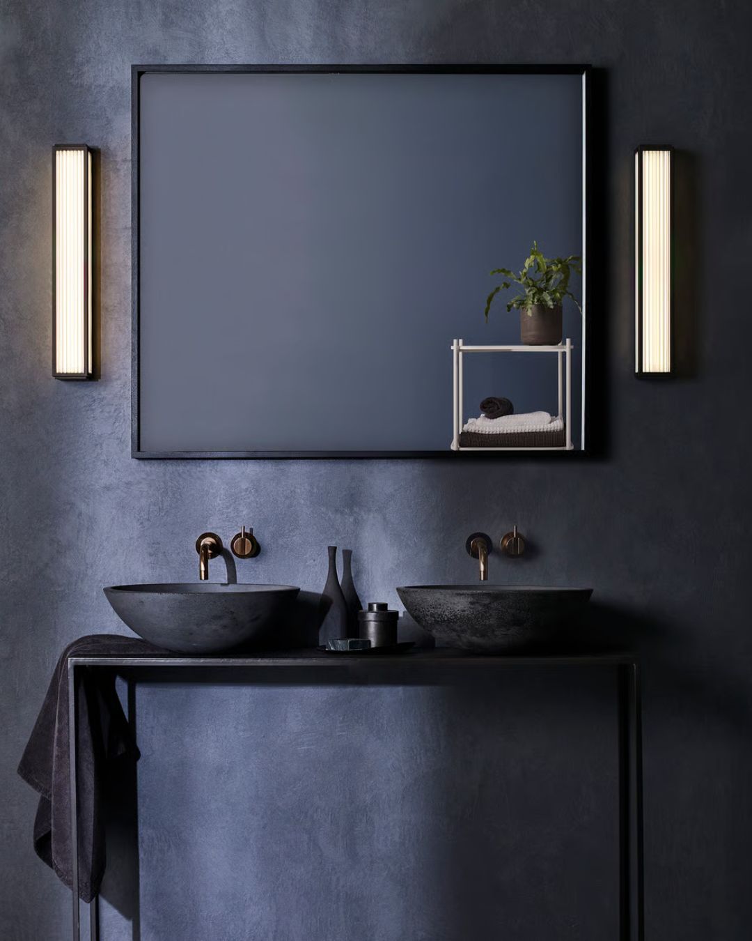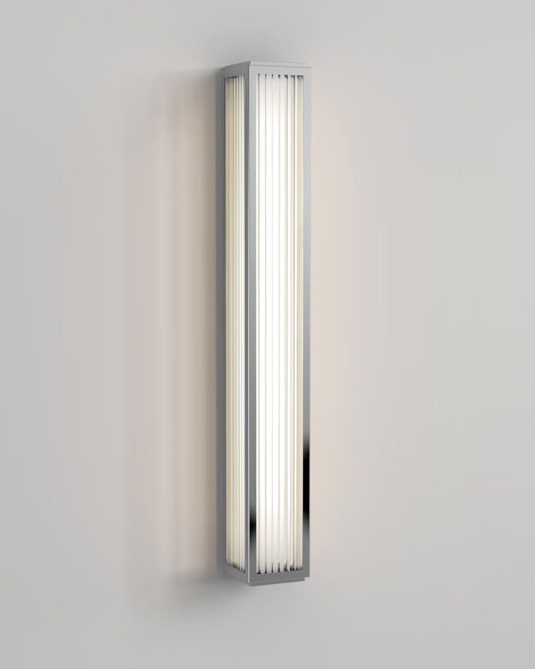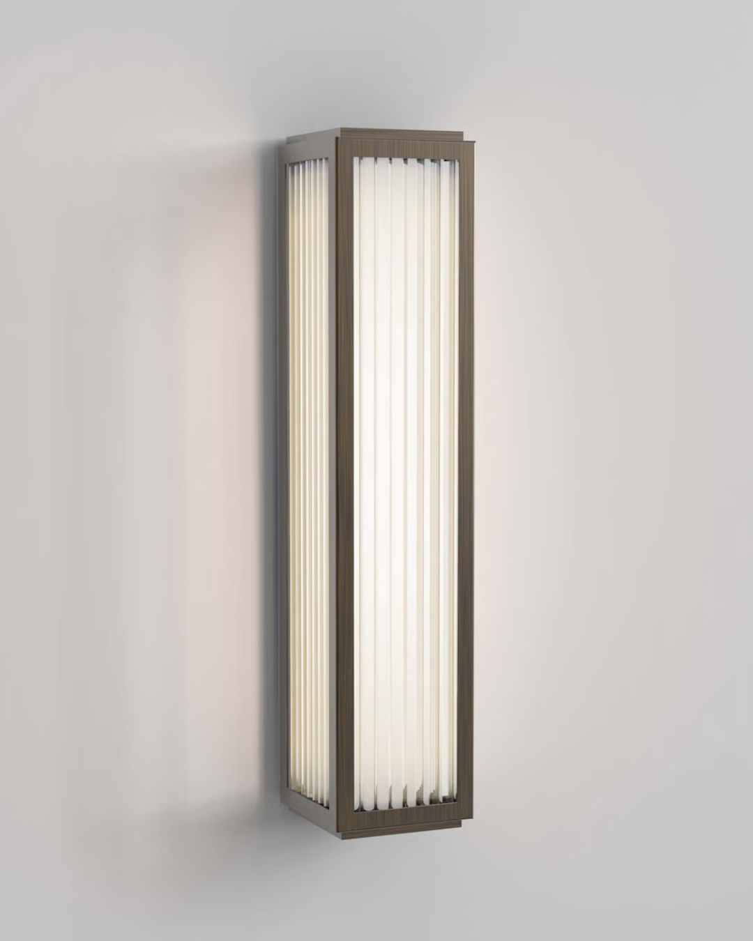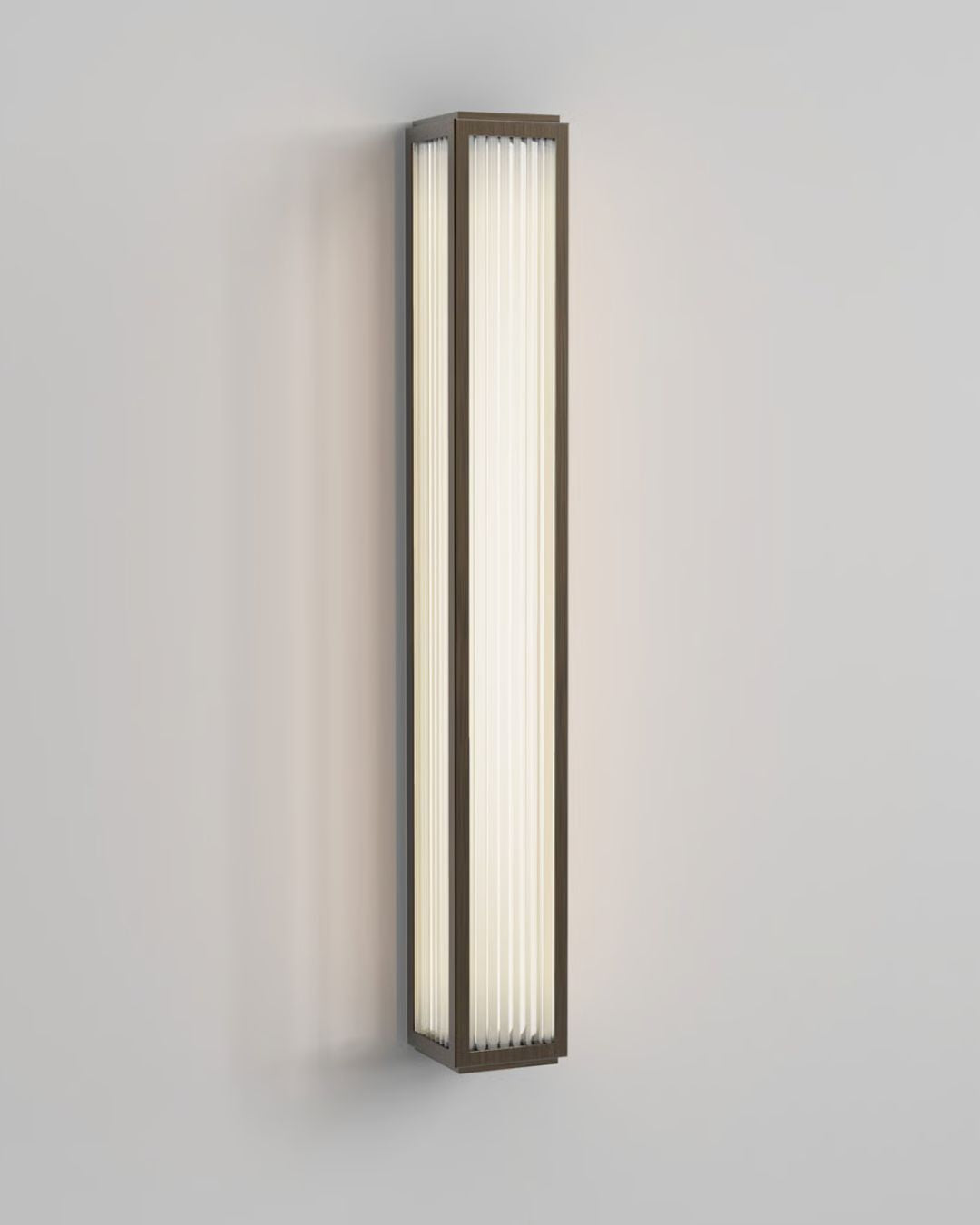 This elegant mid-century wall light is created with circular glass rods that are held within a rectangular frame in two stunning finishes. Adding a touch of sophistication to any bathroom interior with its simple design and the perfect contrast between the polished chrome/ bronze and frosted glass.