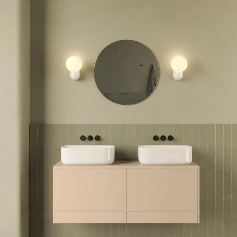 This contemporary wall light features a glossy ceramic base and duplex glass globe, lending any modern bathroom interior a stylish flair. Its IP44-rated construction ensures safe, reliable use for years to come. Boasting an extremely durable ceramic base and glass shade, this light is ideal for providing warm, comfortable lighting in bathrooms, hallways or bedrooms.