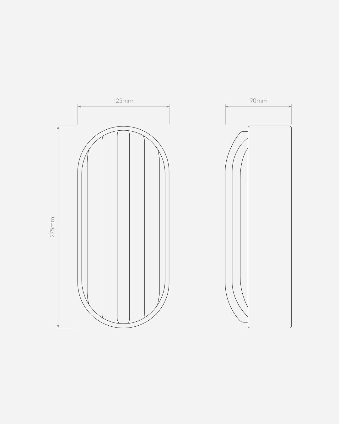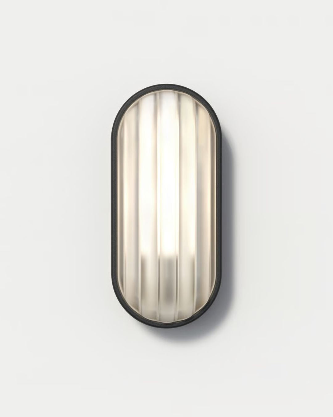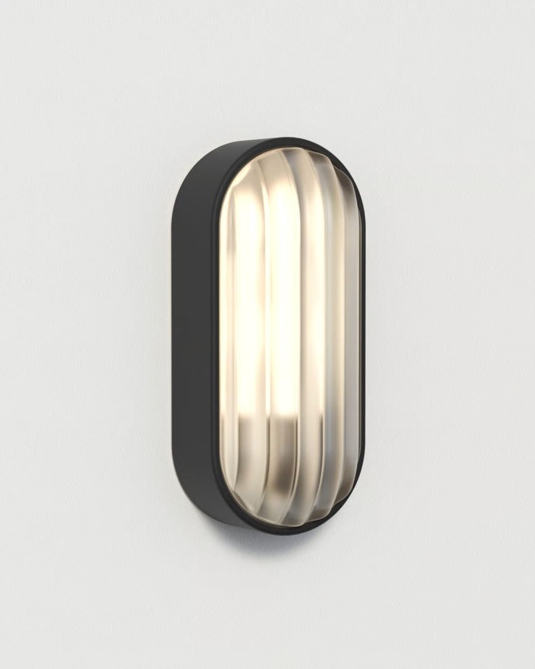 The Oval Wide-Ribbed Glass Bulkhead Light is a modern interpretation of a classic bunker light. Featuring a ribbed sand-blasted glass shade with a black metal frame, this fitting is ideal for installation in entryways and on facades.