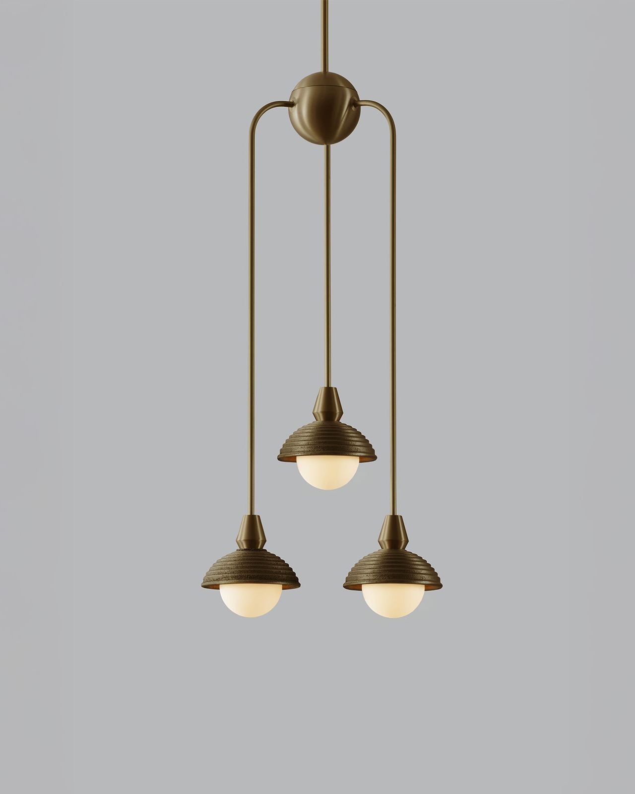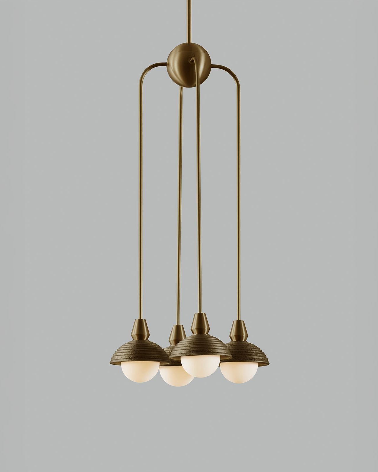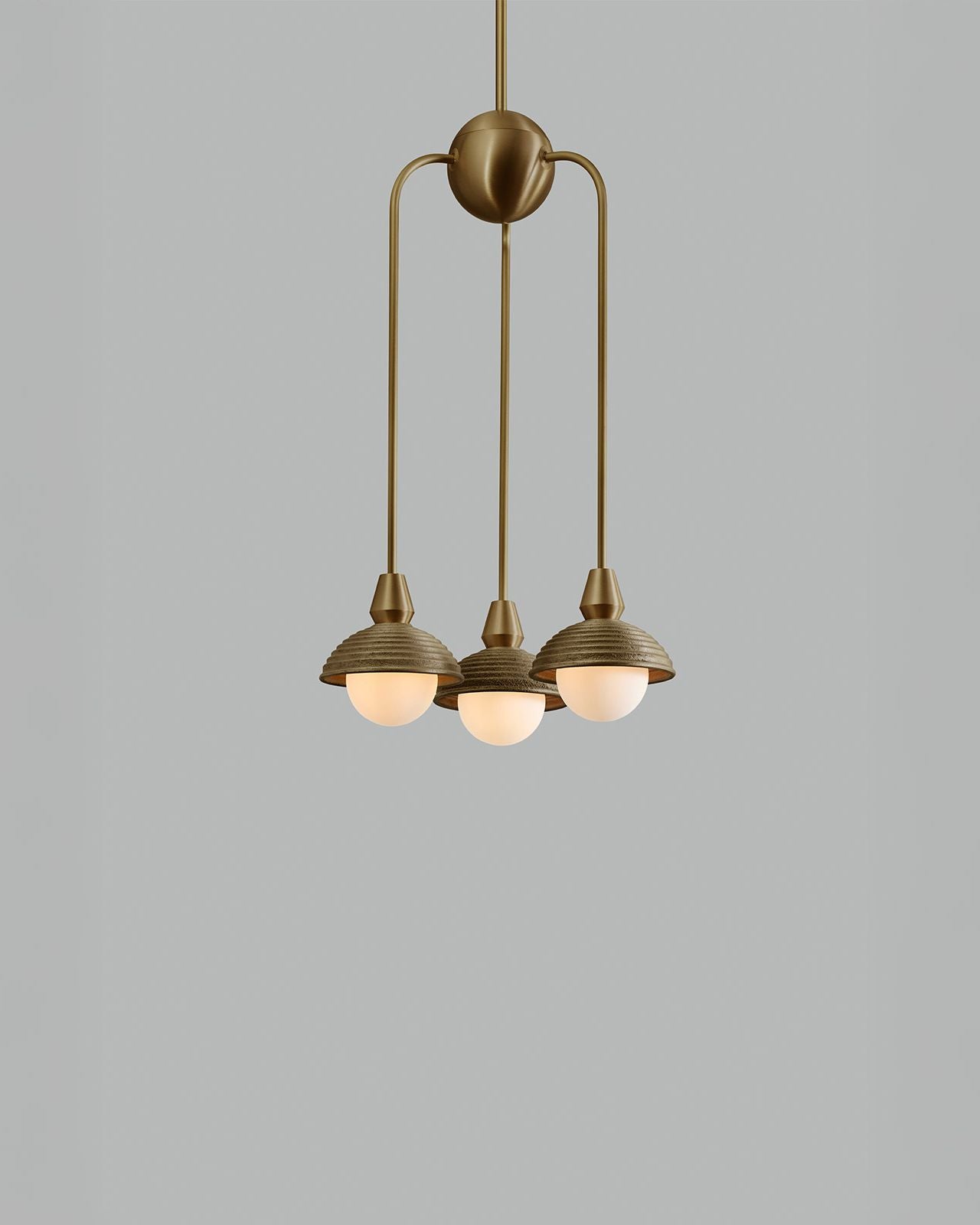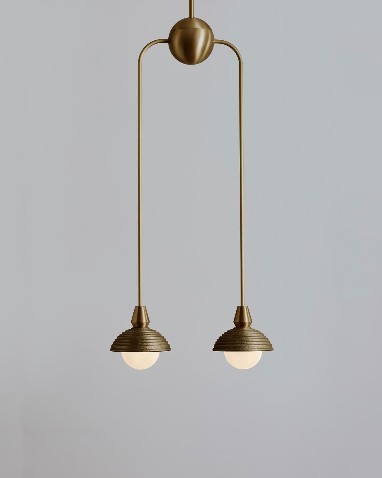 Hand-crafted in England, this pendant combines traditional sand-casting techniques with finely executed CNC-machined brass components. The softly textured cast metal shades contrast elegantly with crisp metallic detailing, while opal glass diffusers provide a warm, evenly dispersed light. Available in a selection of rich metal finishes, the pendant brings a timeless yet modern character to interiors, whether used as a singular statement or repeated rhythmically through a space. This fitting is ideal for mid-century modern and modern classic interiors.