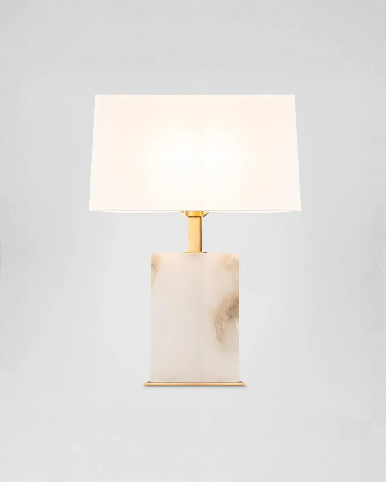 Making every corner shine with refined allure, this elegant table lamp features a rectangular base made from high-quality alabaster. Combined with a white linen shade, this fixture will provide soft illumination. Displayed on a console in a classic or traditional living room, near an entrance, in a reading nook or as a bedside lamp, this fitting includes brass details adding an elegant and refined touch to interior spaces.