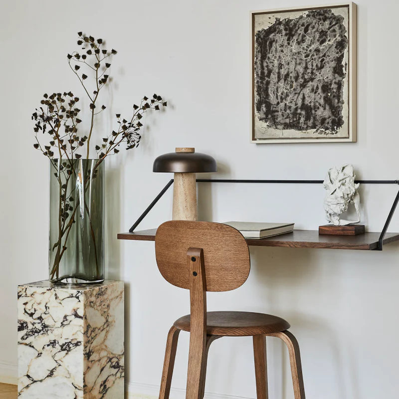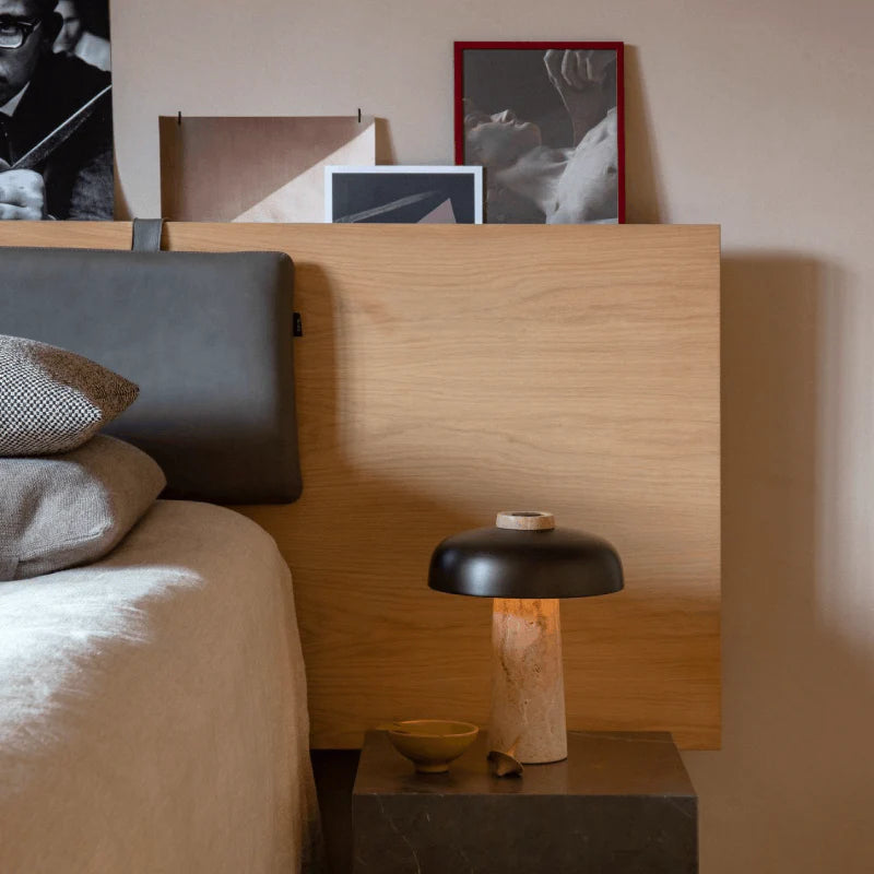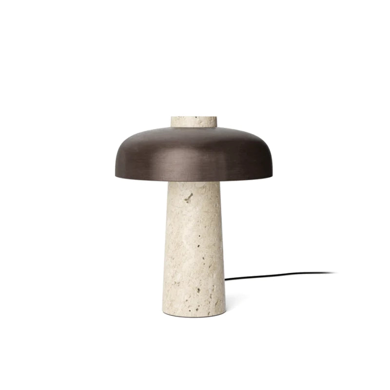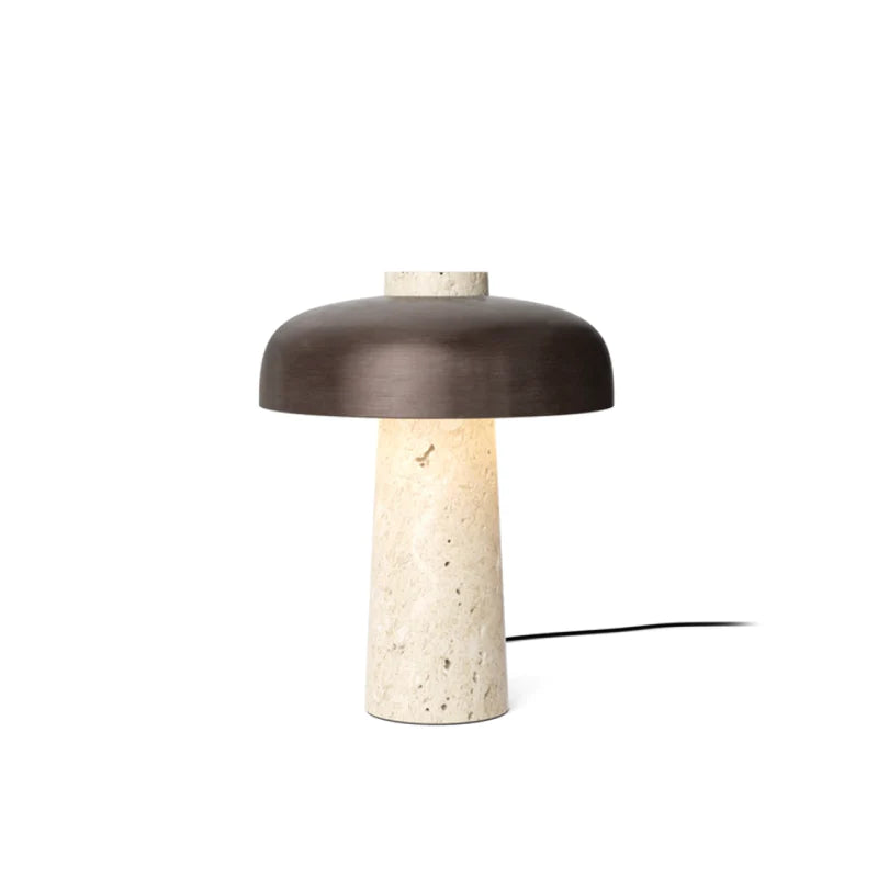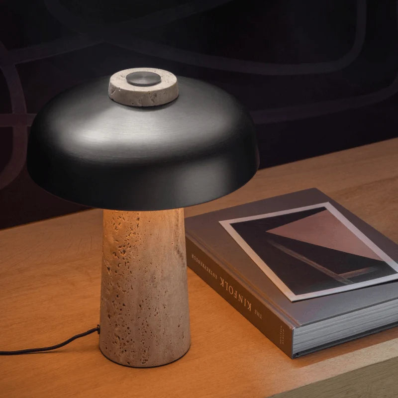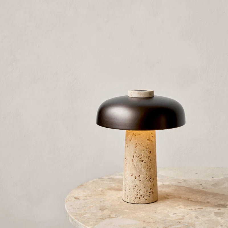 Made by Danish designer Aleksandar Lazic, this object of true design draws inspiration from the Italian marble tables of the 1970s. This table lamp is a striking creation that accentuates the beauty of natural materials, featuring a conical travertine base and a curved bronzed aluminum shade. The dim-to-warm LED light source is dimmable to provide a cozy and inviting ambiance while highlighting the natural irregularities of the stone. It is perfect for living rooms, bedrooms, or reading nooks.