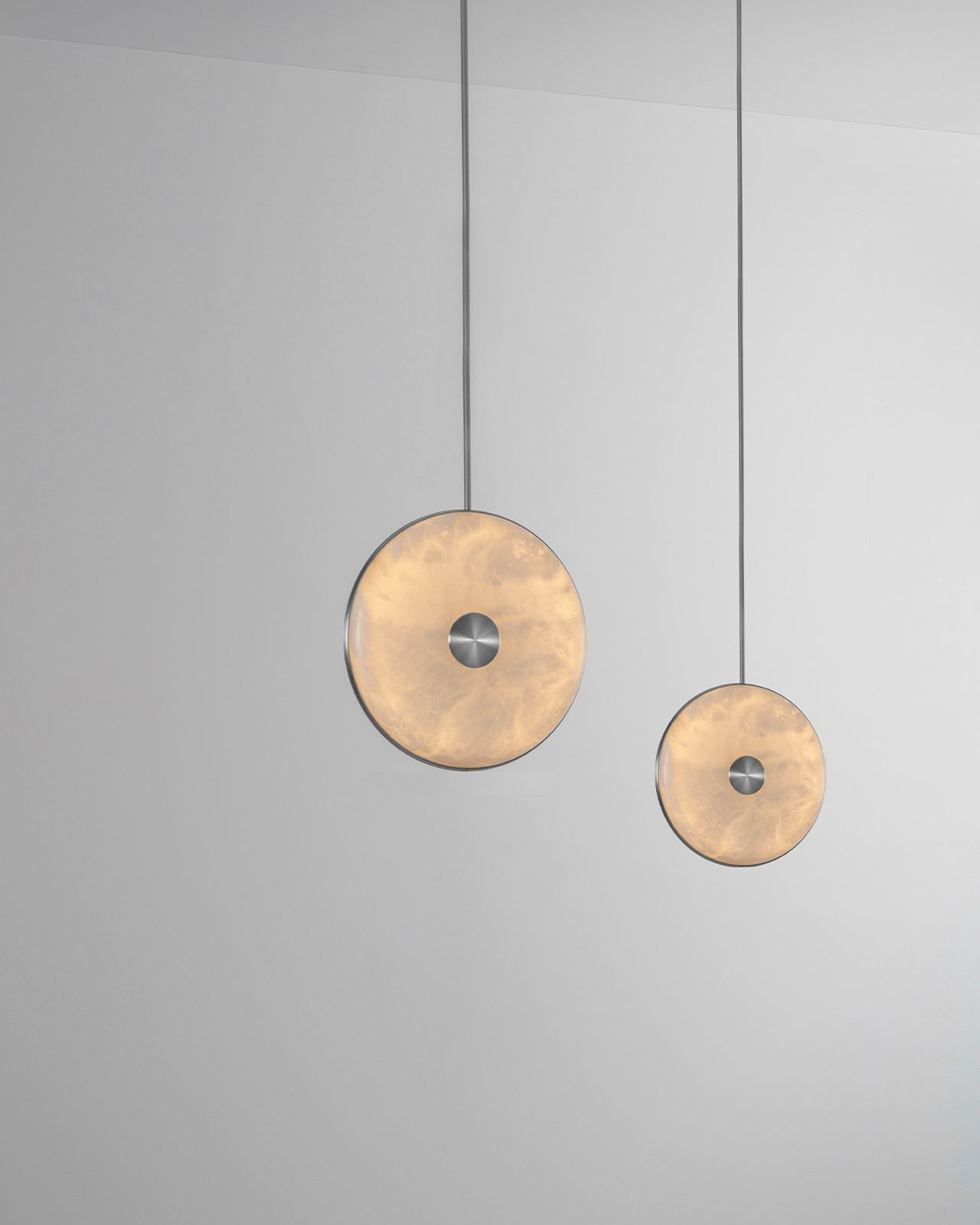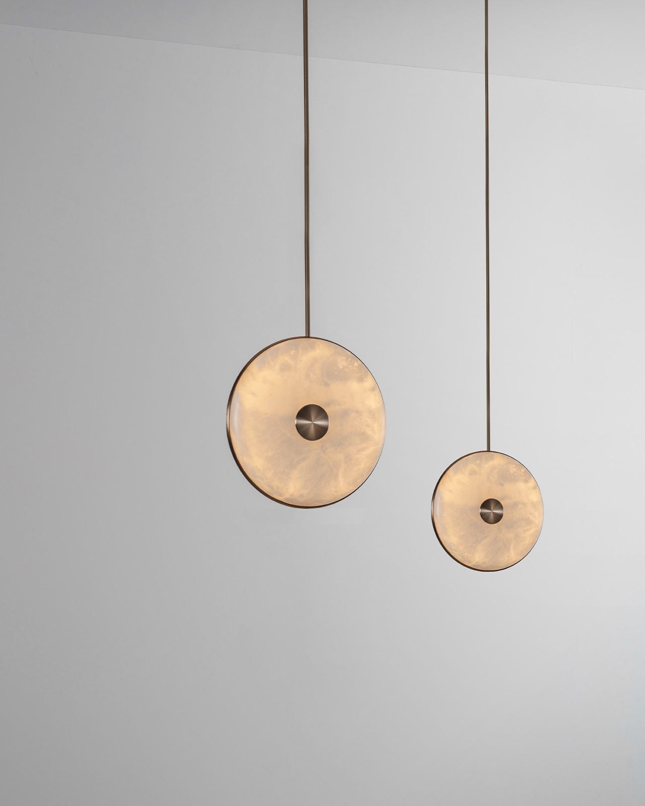 This pendant light showcases a natural spherical alabaster stone, expertly combined with precision machined brushed brass and suspended from a solid brass stem. The result is an elegant piece that adds effortless style to interiors, whether displayed individually or in a cluster with varying heights. The unique veining of the stone adds a touch of organic luxury.