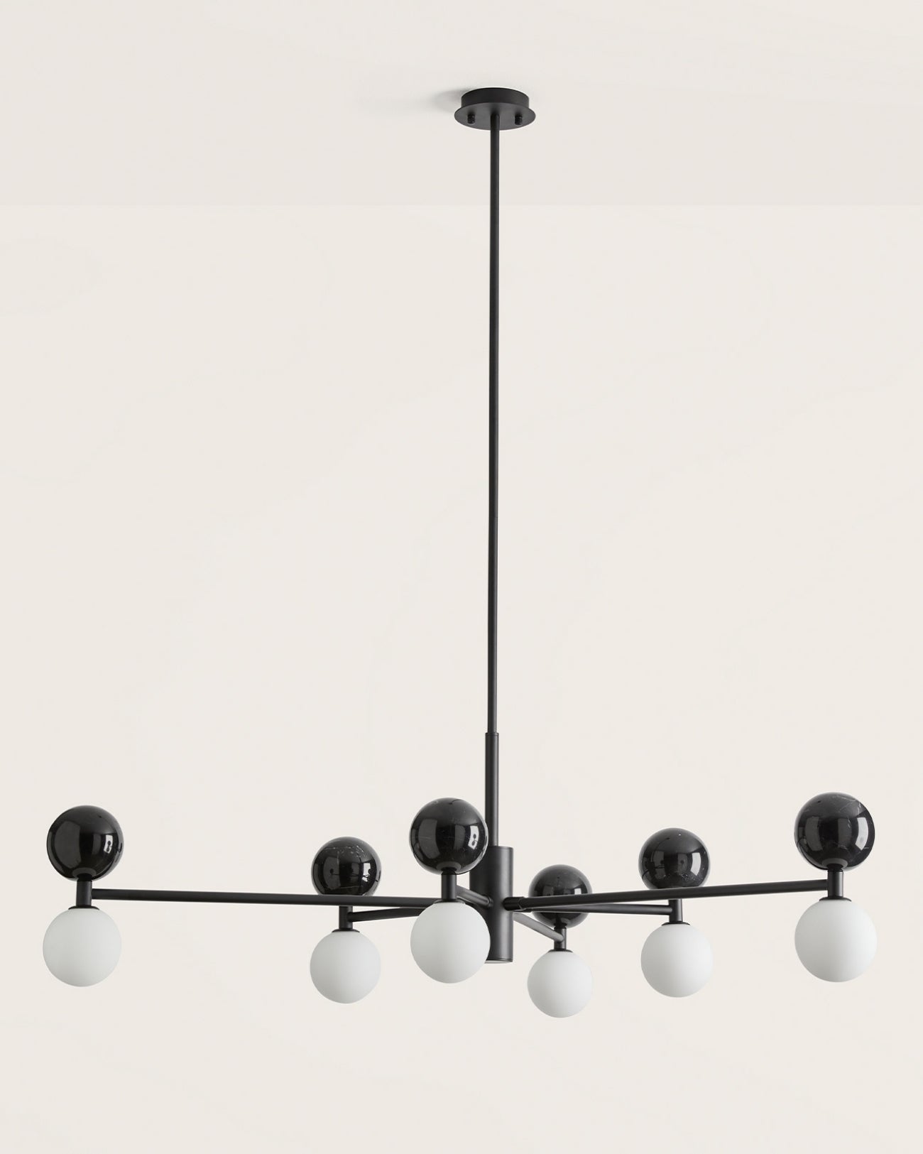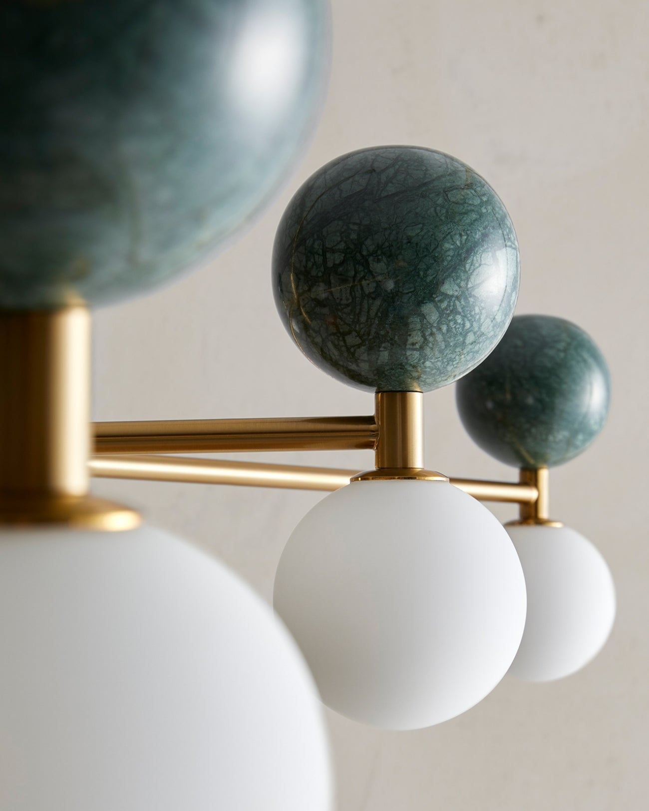 Combining Marble, Steel and Glass this harmonious design showcases outspread arms that will become a centrepiece within any interior. This Minimalistic pendant features six spherical opal glass diffusers that each house a G9 3000K LED. Each light is topped by a Green or Black marble orb that gives this design a decorative feel. Available in Matte Black or Old Gold.