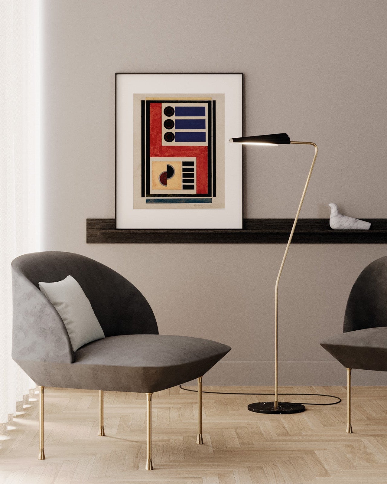 Modern chair and floor lamp against a neutral wall with archway