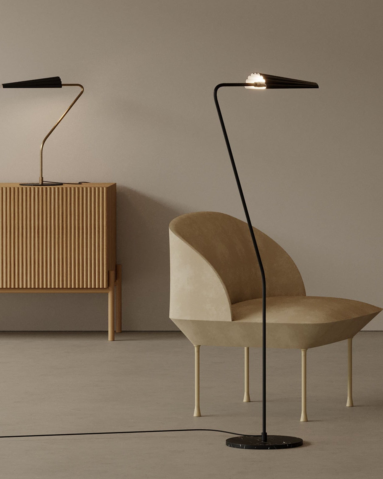 Modern black floor lamp with a beige chair and wooden cabinet against a plain wall.