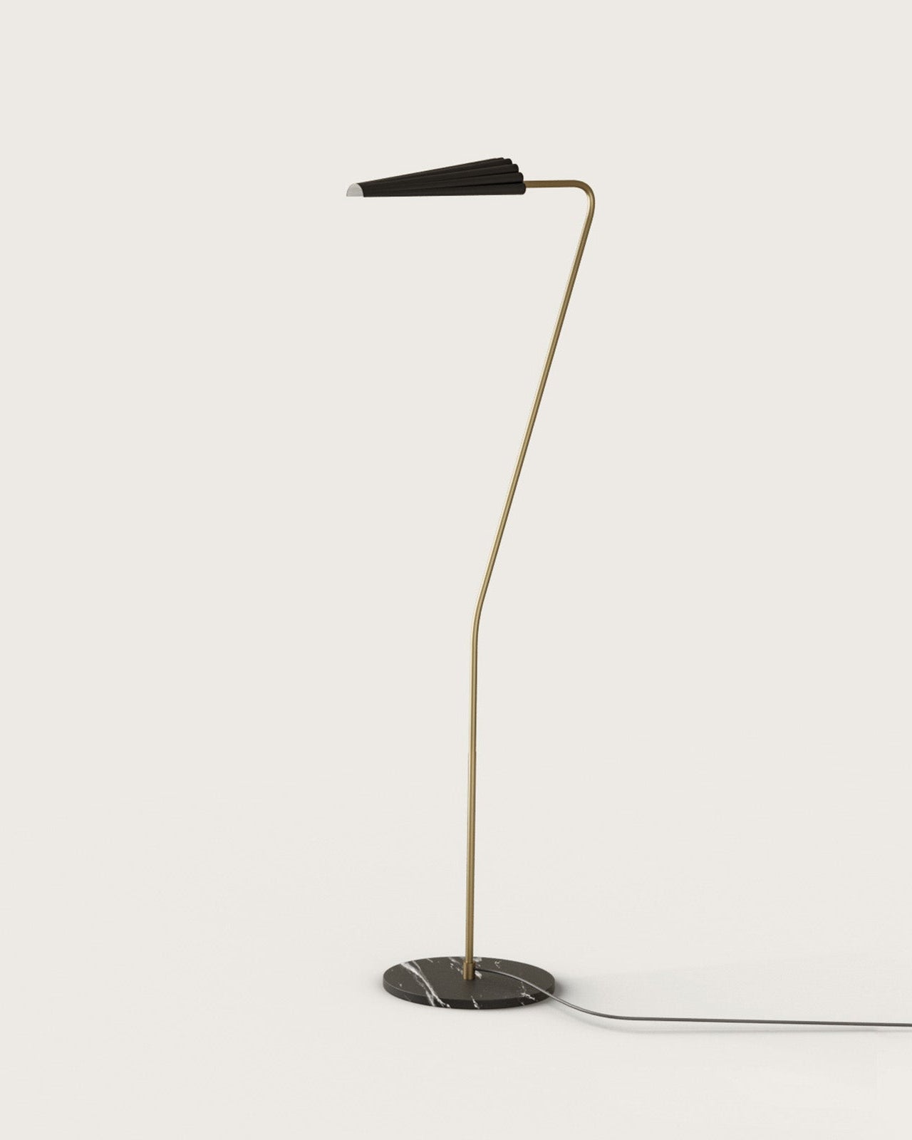 This interior dimmable floor lamp will stand out in modern interiors and is especially perfect for reading nooks. This refined light features a dark marble disc base, a sleek steel body, and a corrugated steel shade, and is available in different finishes. Not only will this lamp elevate your interiors but it also provides a high-quality light downwards.