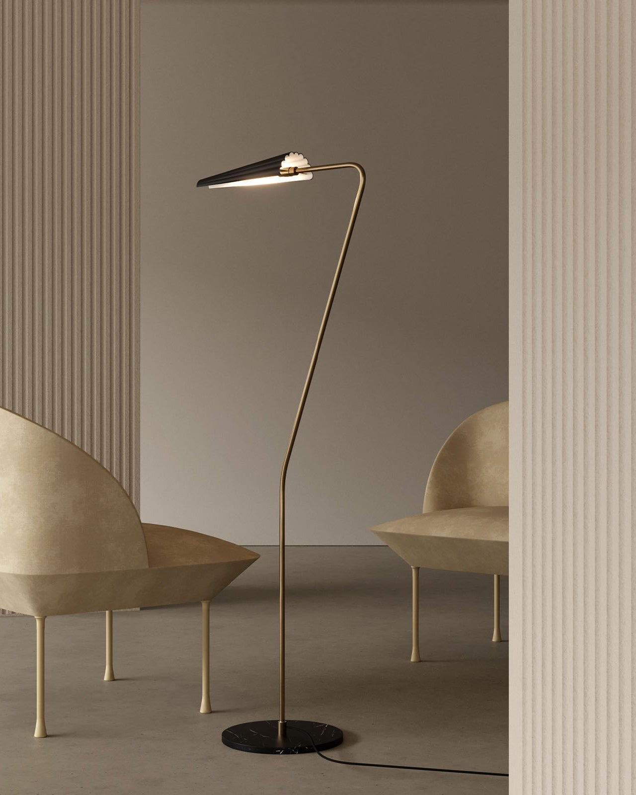 Modern floor lamp with a curved design in a minimalistic room.