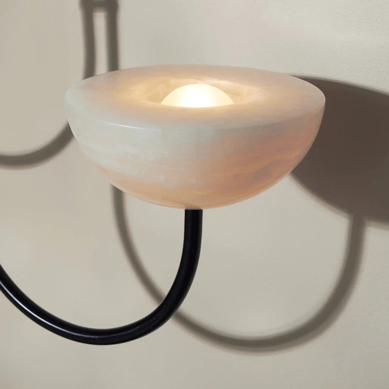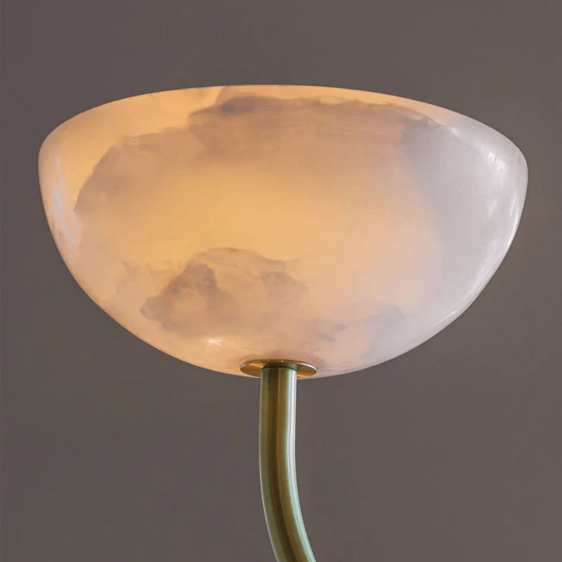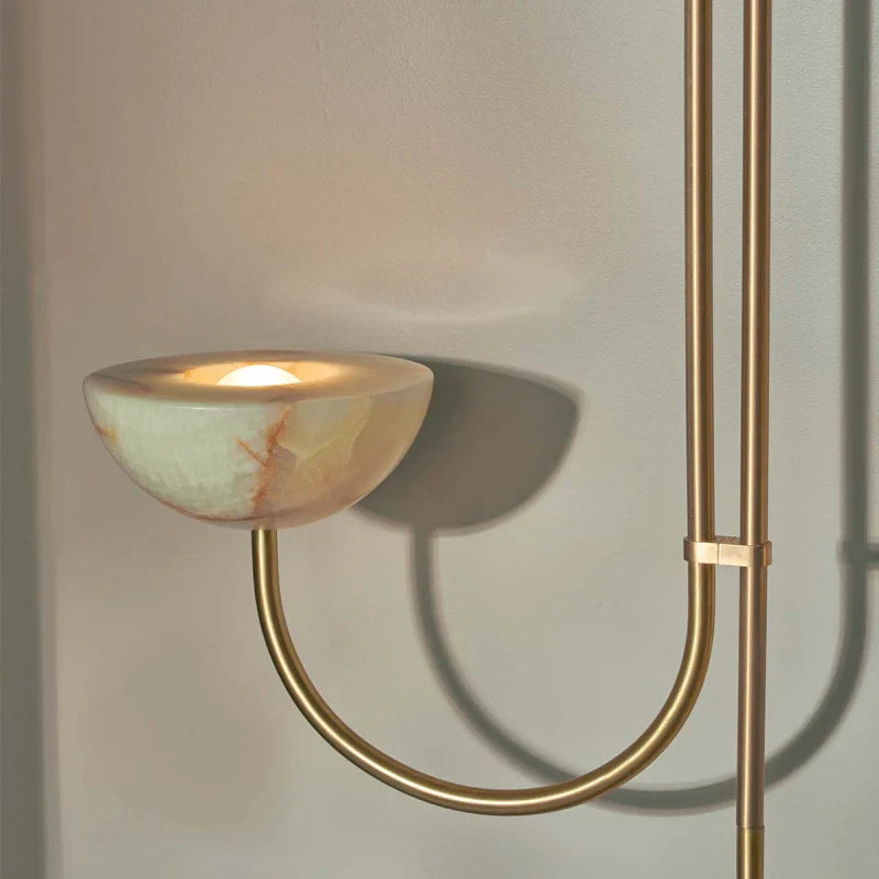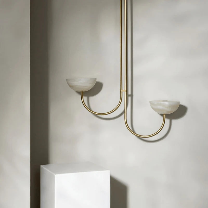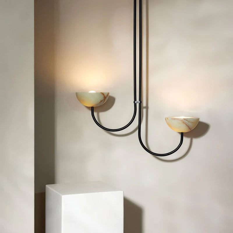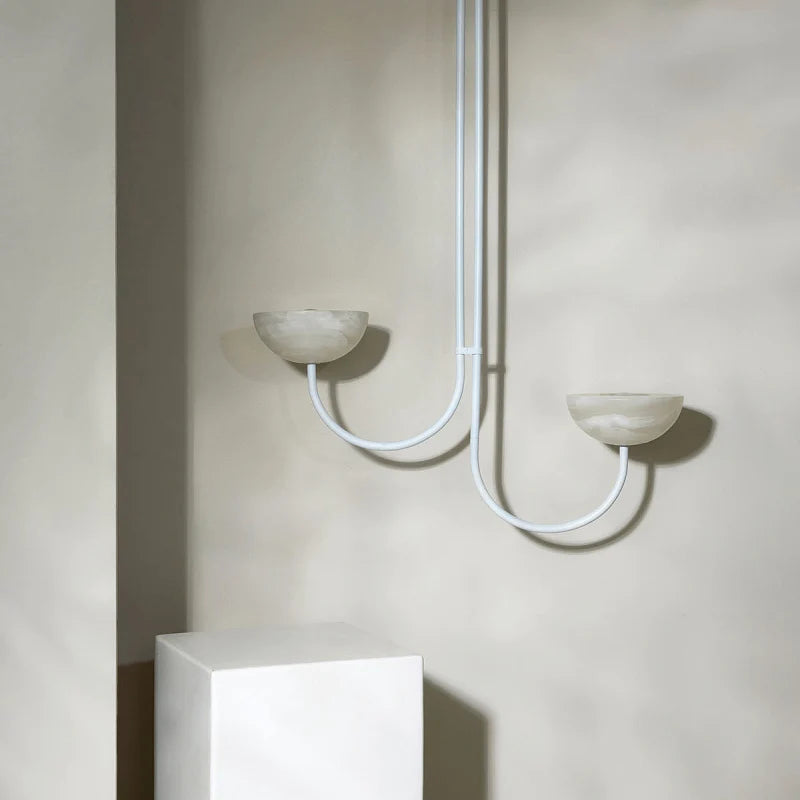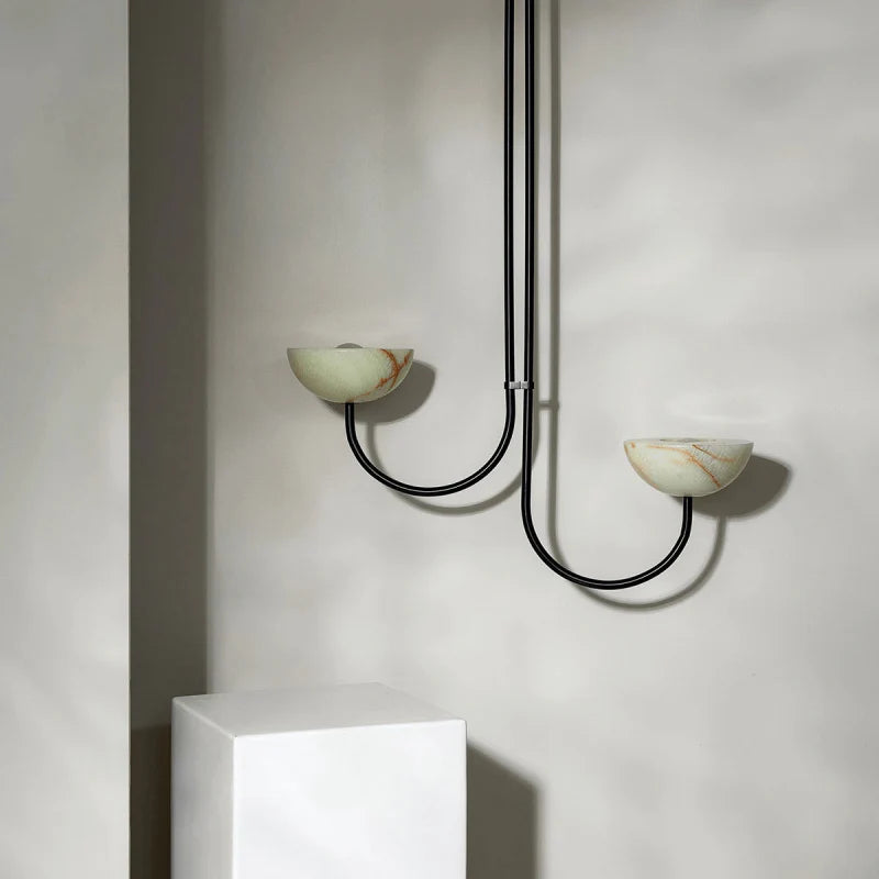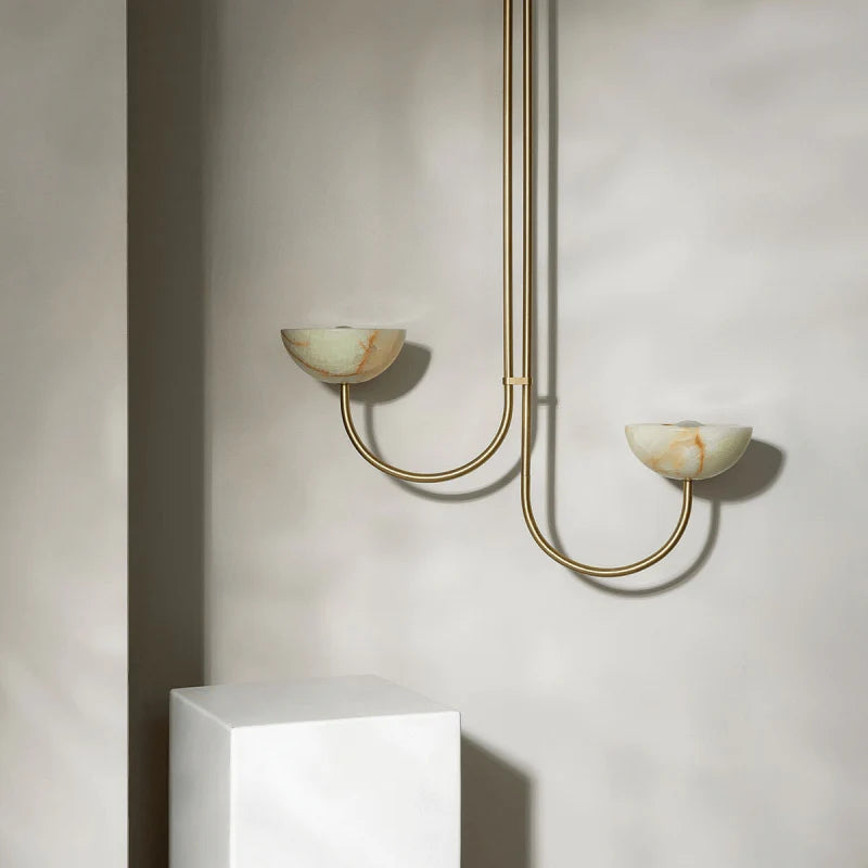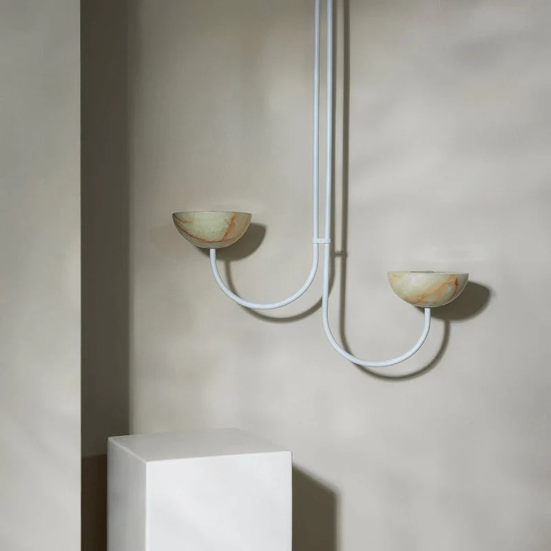 This contemporary asymmetrical double pendant perfectly combining the hardness of white or jade onyx with the feminine sensibility of the gentle curves of the domes and the metal structure. The elegant arms, available in brass, brushed black or satin white finish, hold the upside-down shades for a beautiful soft illumination spread in living rooms, dining rooms or bedrooms. This dual light is available in a small or large size to suit any interior space.