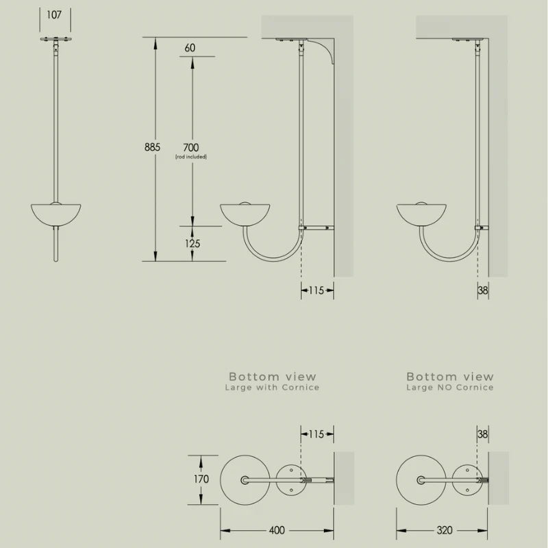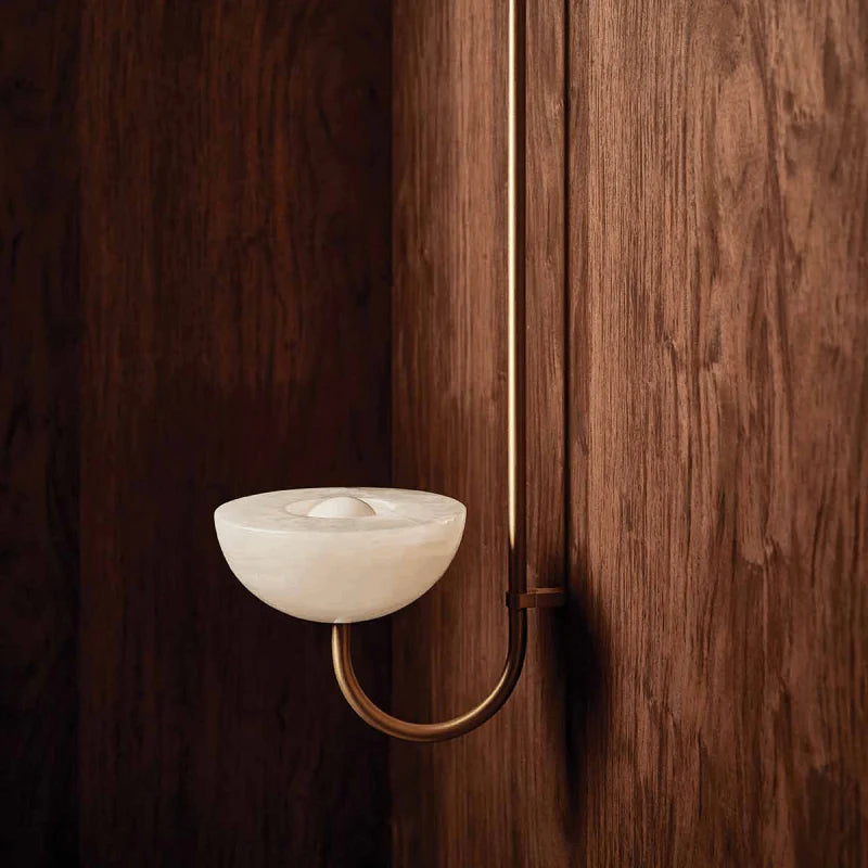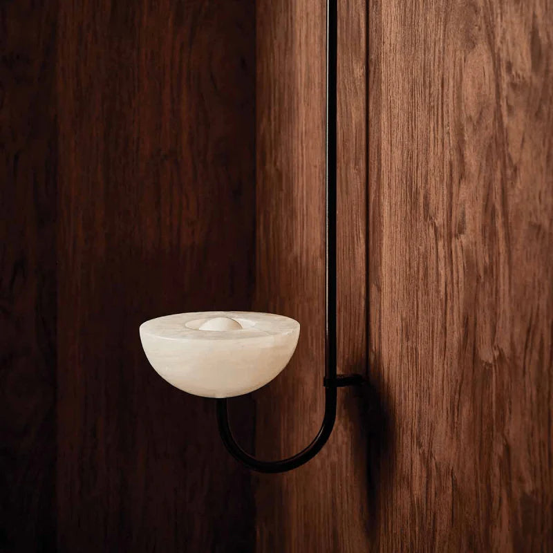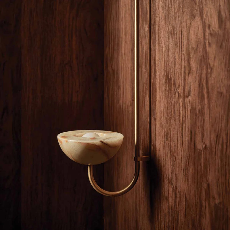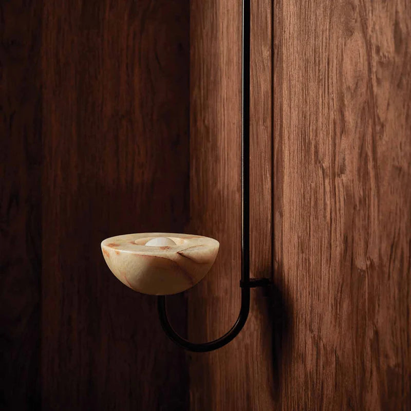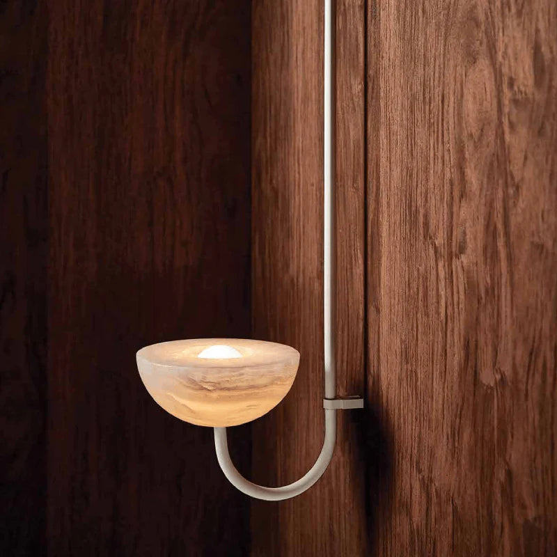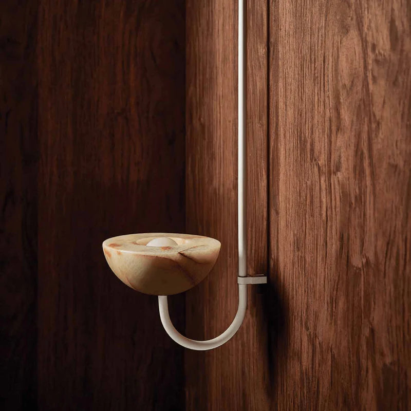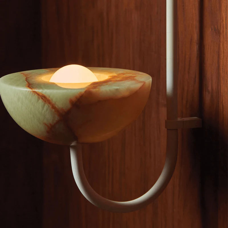 Creating an ethereal cosy ambience, this delicate wall light is available with white or jade onyx stone. Featuring a long curved metal arm available in three finishes and attached to the ceiling and the wall, and an elegant dome shade turned upside down for a unique illumination, this fixture can be purchased with an extension allowing for 115mm set-off from the wall, if you have a cornice. IP44-rated, this lighting solution will be suitable for any contemporary or modern interior from kitchens to bathrooms.
