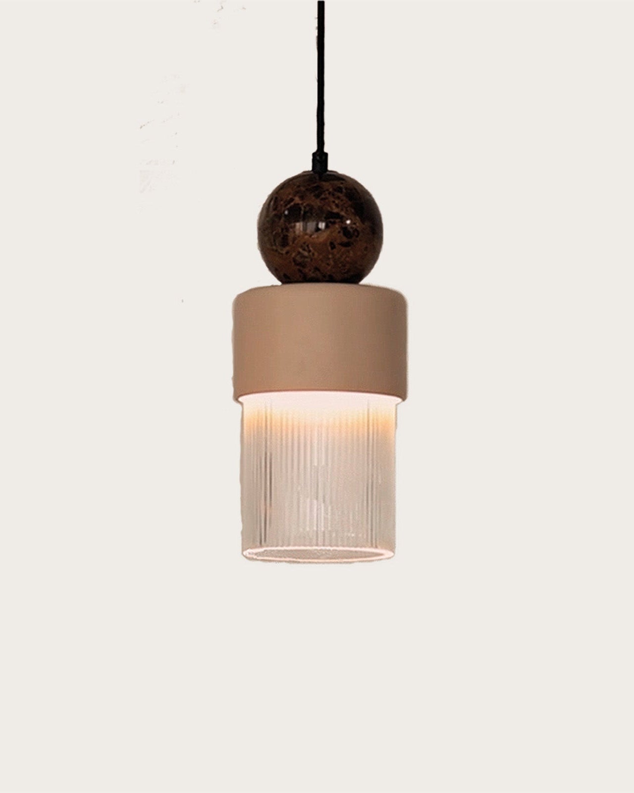 Designed in Spain, the Ribbed Brown Marble Pendant features distinctive characteristics of a nude ceramic lid, a striped clear glass and a brown marble sphere to reveal a silhouette that aims to evoke the balance between solidity and lightness. This pendant is ideal for modern interiors looking to enhance spatial sophistication. Suited to be installed as a singular pendant or as a cluster of pendants to make a design statement.