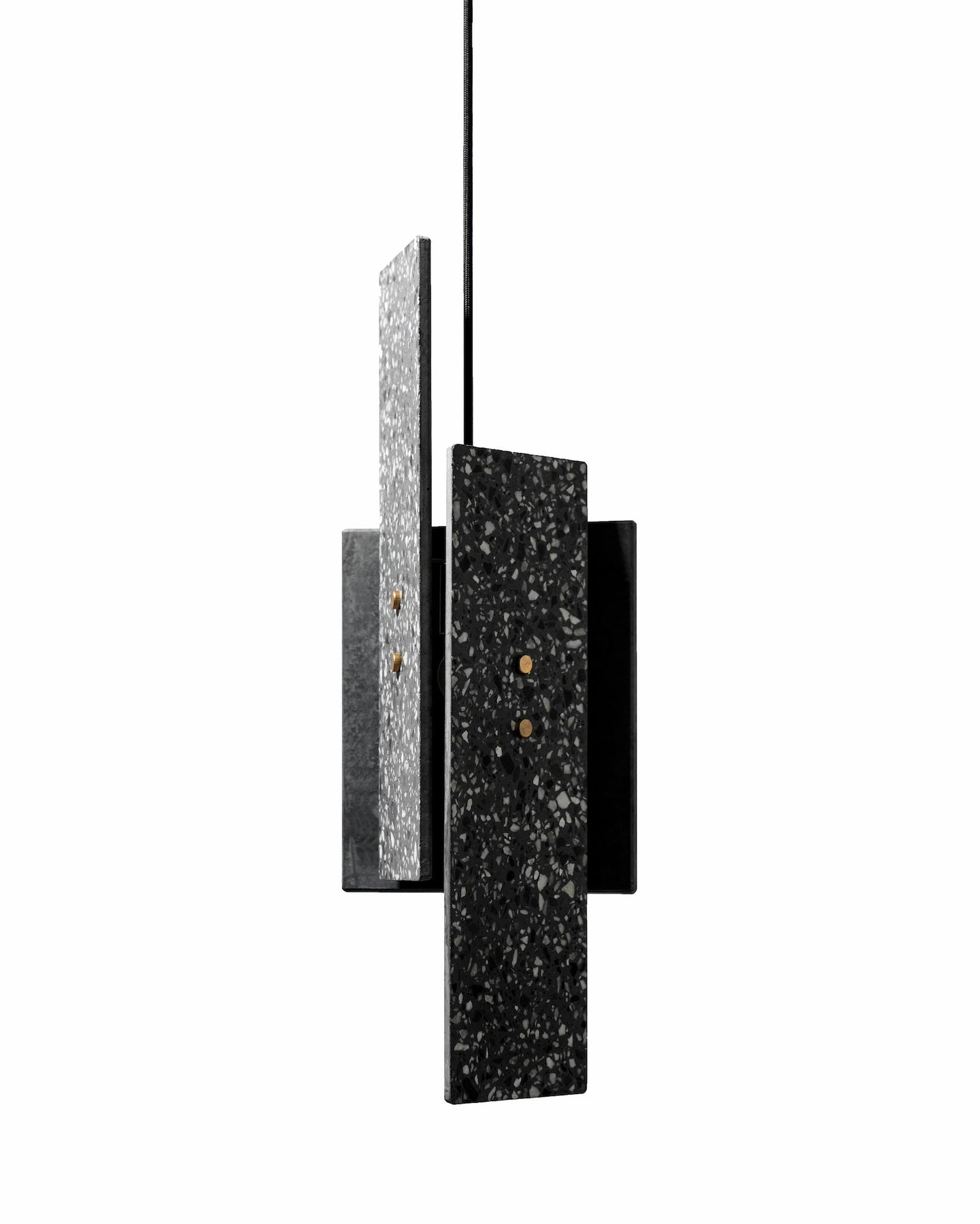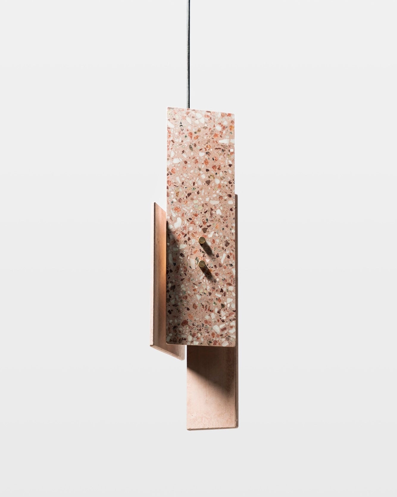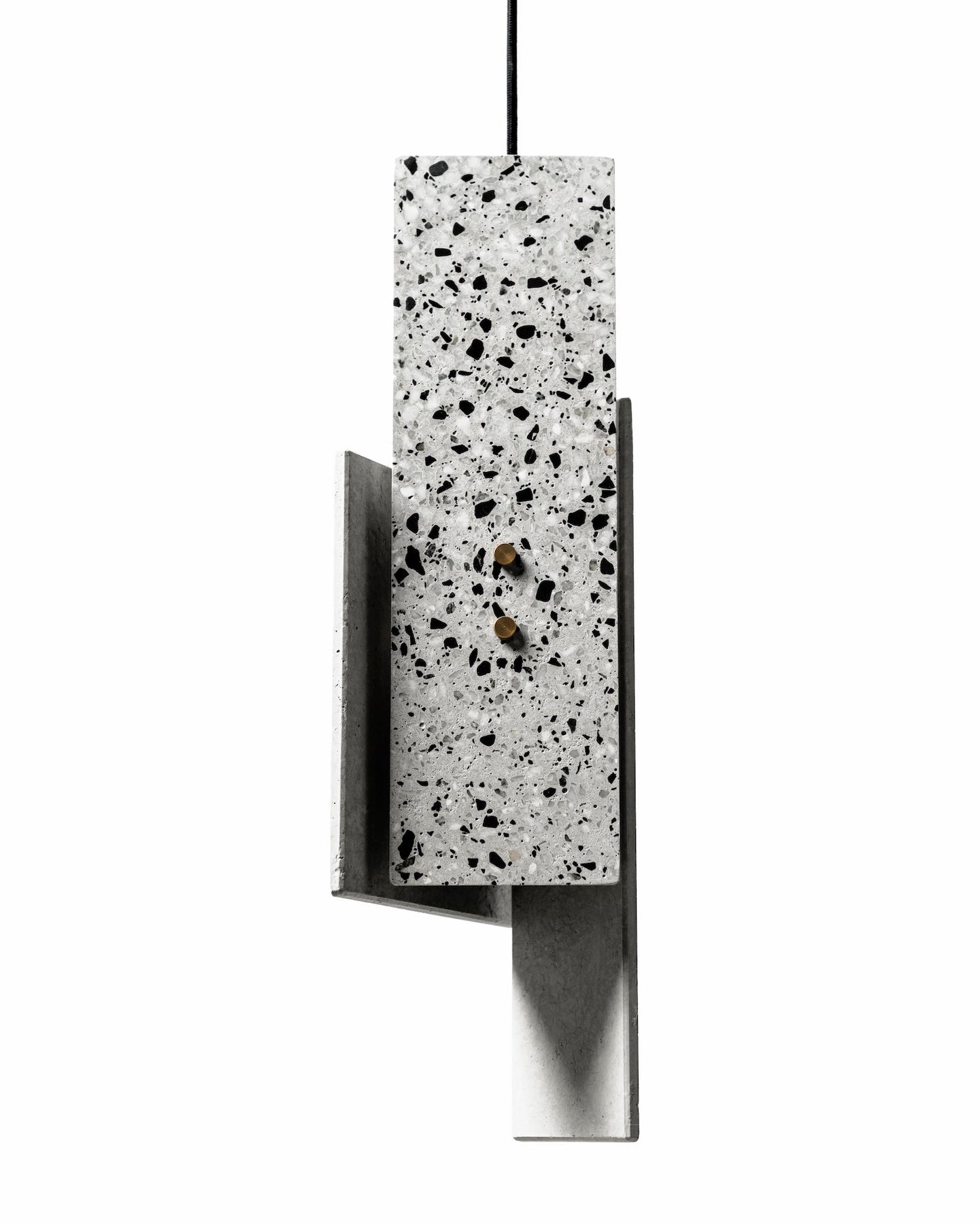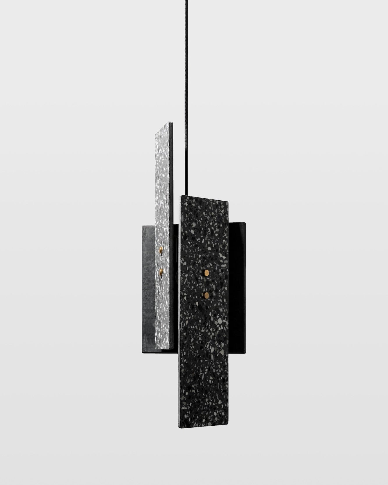 The Piece Terrazzo Pendant Light features a dynamic design of three pieces, each suspended by a sleek, brass framework that subtly supports the overall form. The minimalist yet substantial design brings boldness and texture to interior settings.