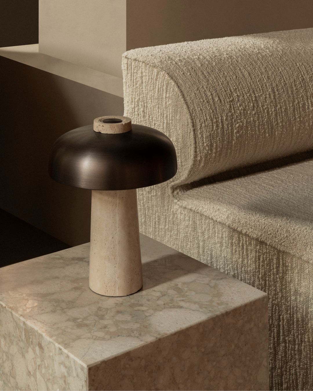 Curved Aluminium and Travertine Table Lamp | Reverse-Lighting Collective