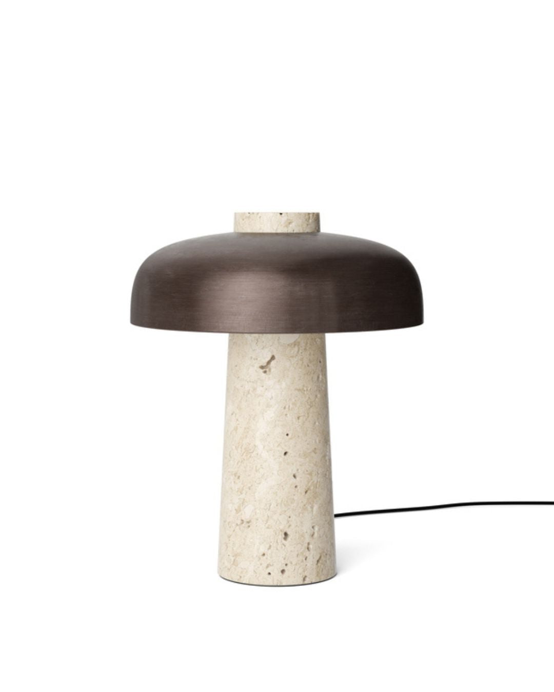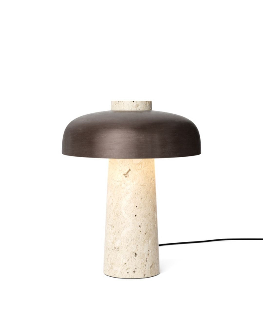 Made by Danish designer Aleksandar Lazic, this object of true design draws inspiration from the Italian marble tables of the 1970s. This table lamp is a striking creation that accentuates the beauty of natural materials, featuring a conical travertine base and a curved bronzed aluminum shade. The dim-to-warm LED light source is dimmable to provide a cozy and inviting ambiance while highlighting the natural irregularities of the stone. It is perfect for living rooms, bedrooms, or reading nooks.