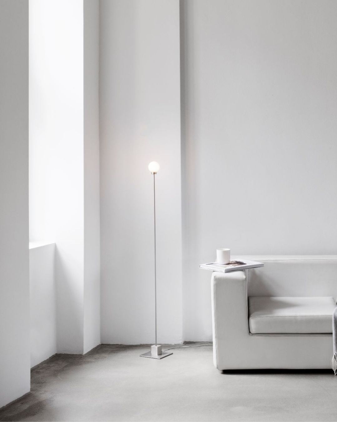 Modern minimalistic room with a floor lamp and white sofa against a plain wall.