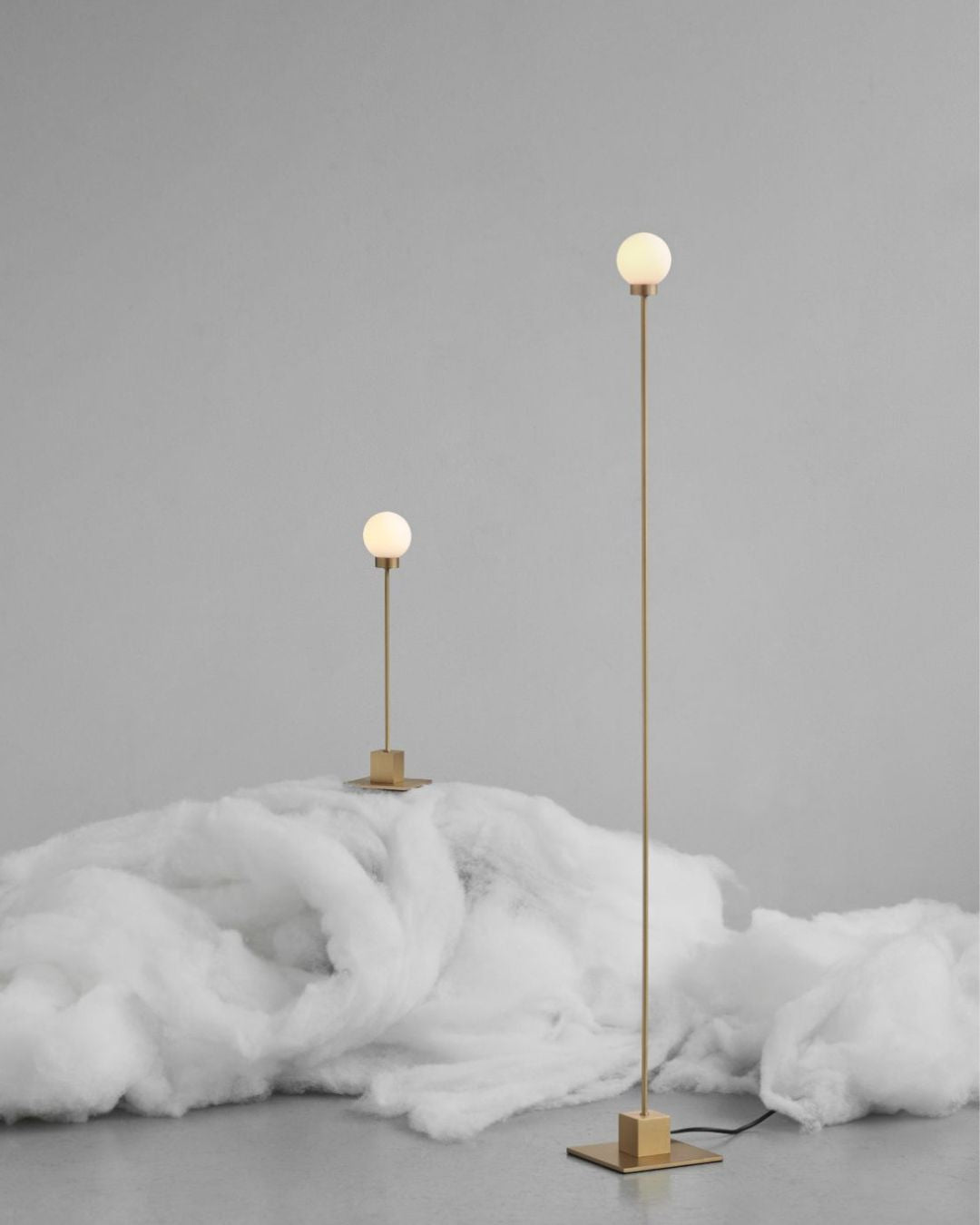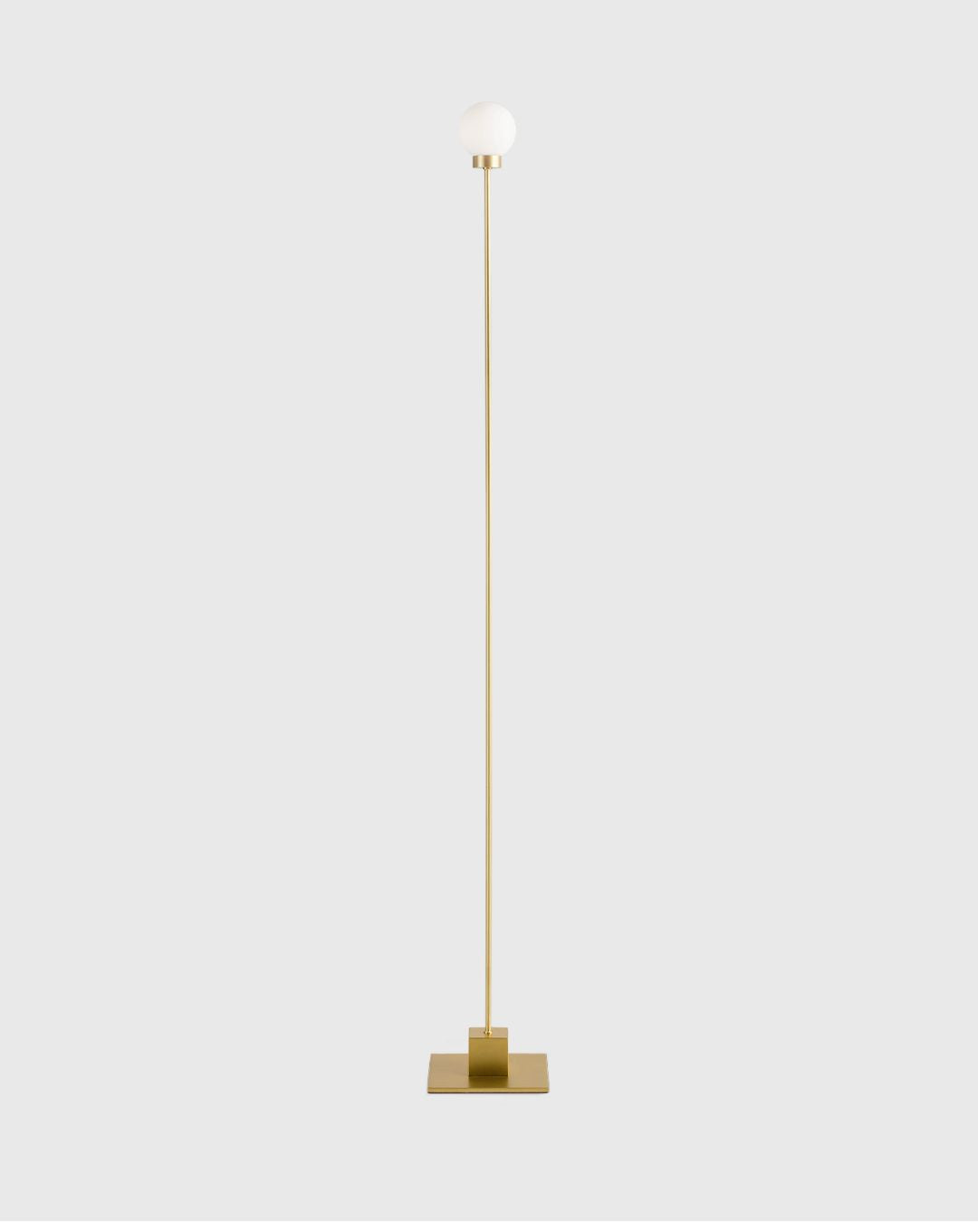 A nordic designer floor lamp inspired by the classical Bauhaus lamp. A minimalist design that features a mouth-blown opal glass shade and angular-shaped plinth base that comes in a White, Metallic, Black or Brass finish. Available with a transparent cable and dimmer that helps emits a soft light in your bedroom, lounge or office.