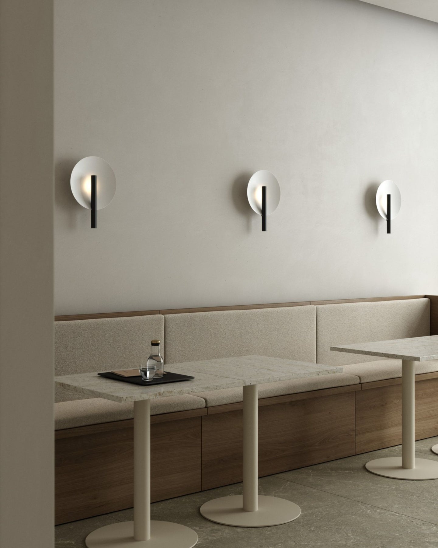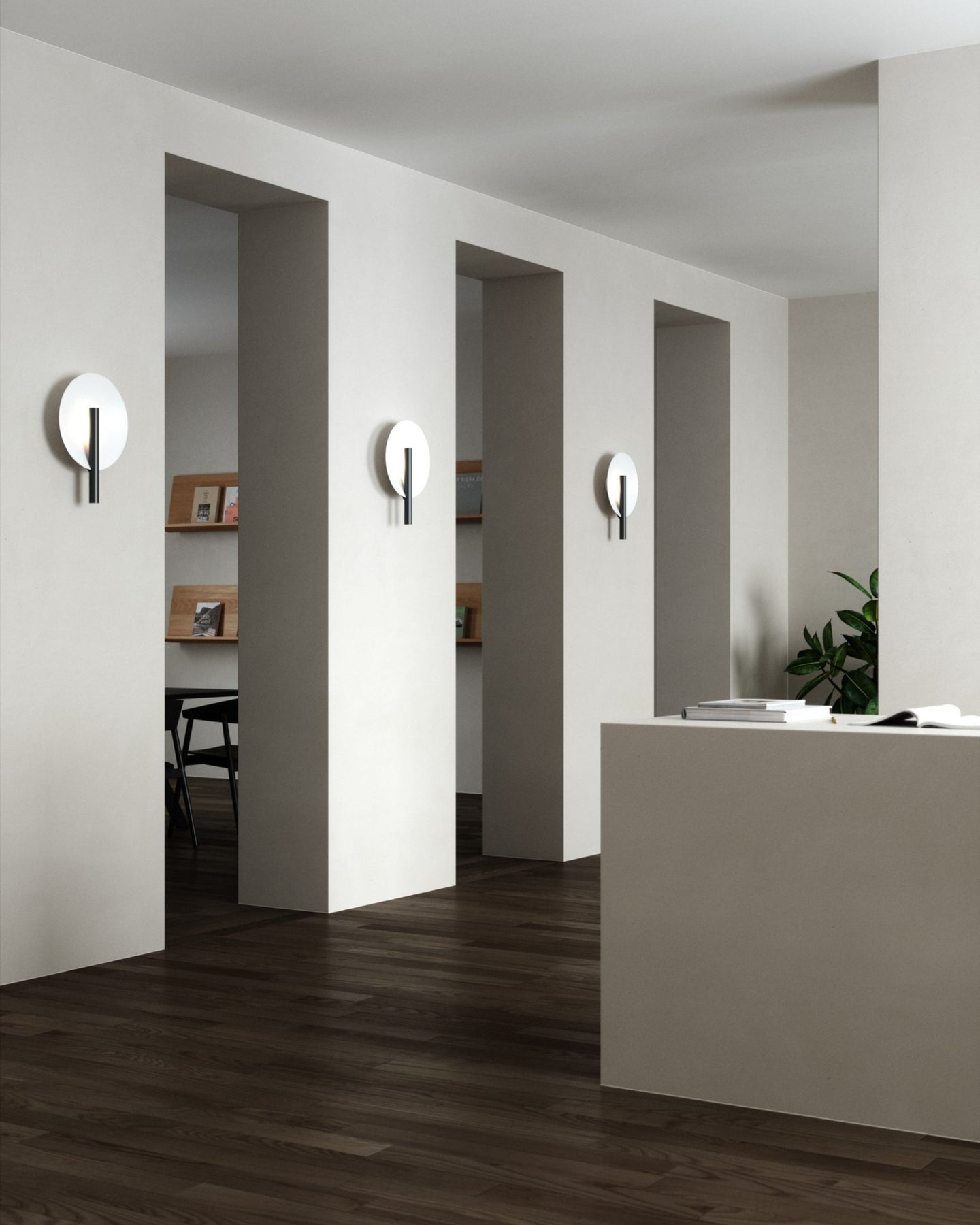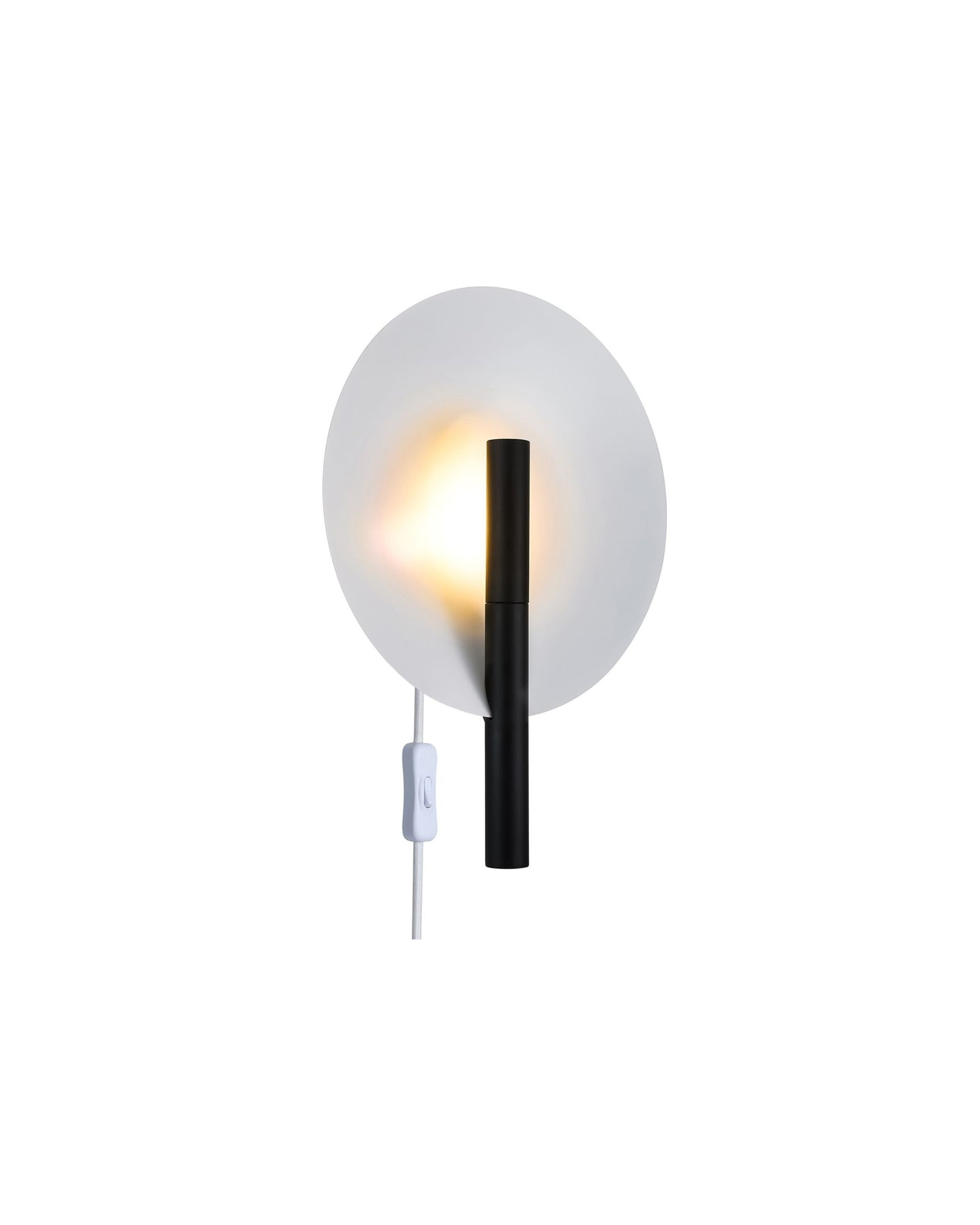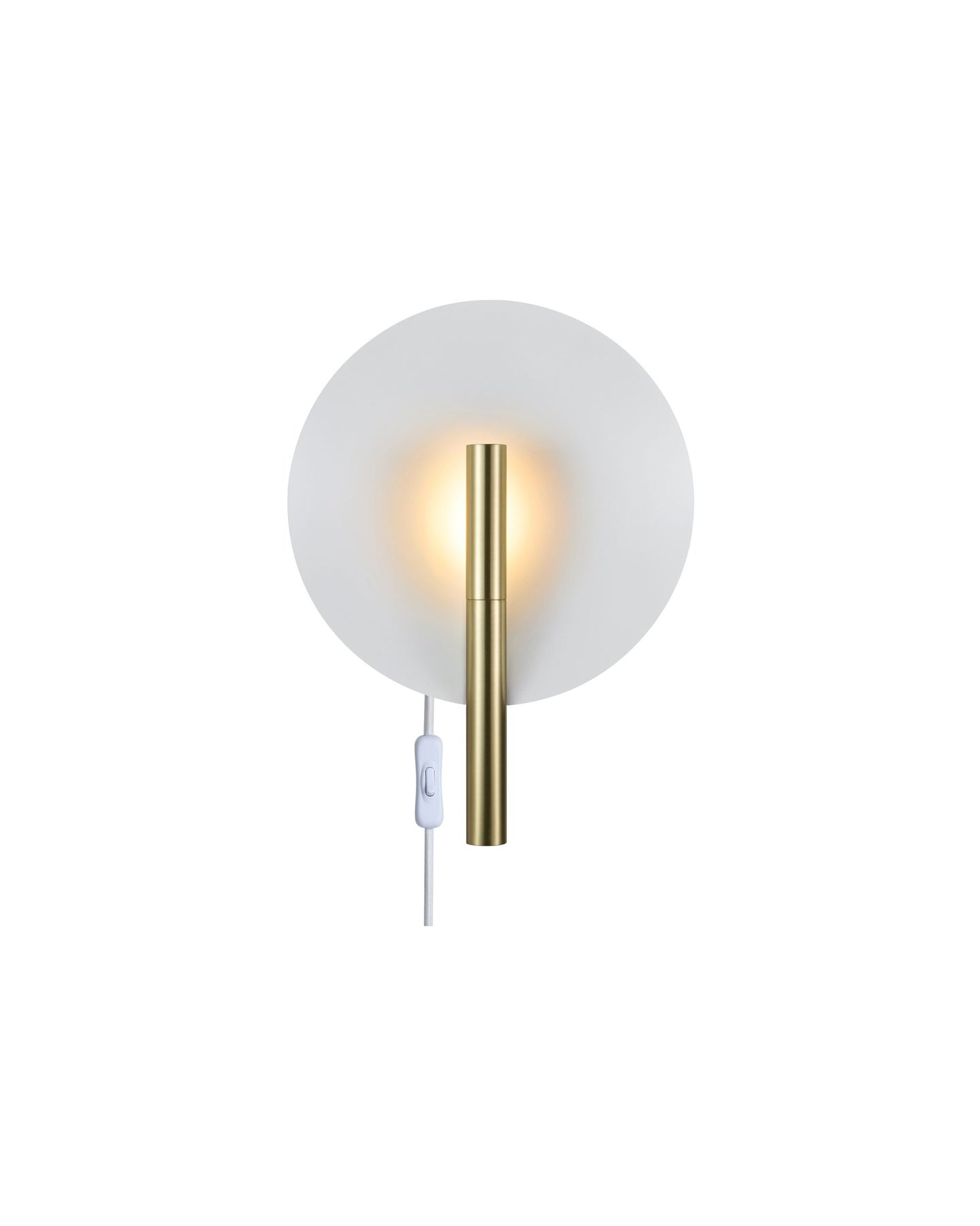 Contemporary spaces will bask in the understated elegance of this wall light, gracefully radiating a warm and inviting illumination in bedrooms, hallways, and living rooms. Minimalist yet elegant, this fixture is composed of a white metal plate and a sleek metal tube, available in black or brushed brass. The light reflects backwards on the large spherical shade providing a comforting ambiance.