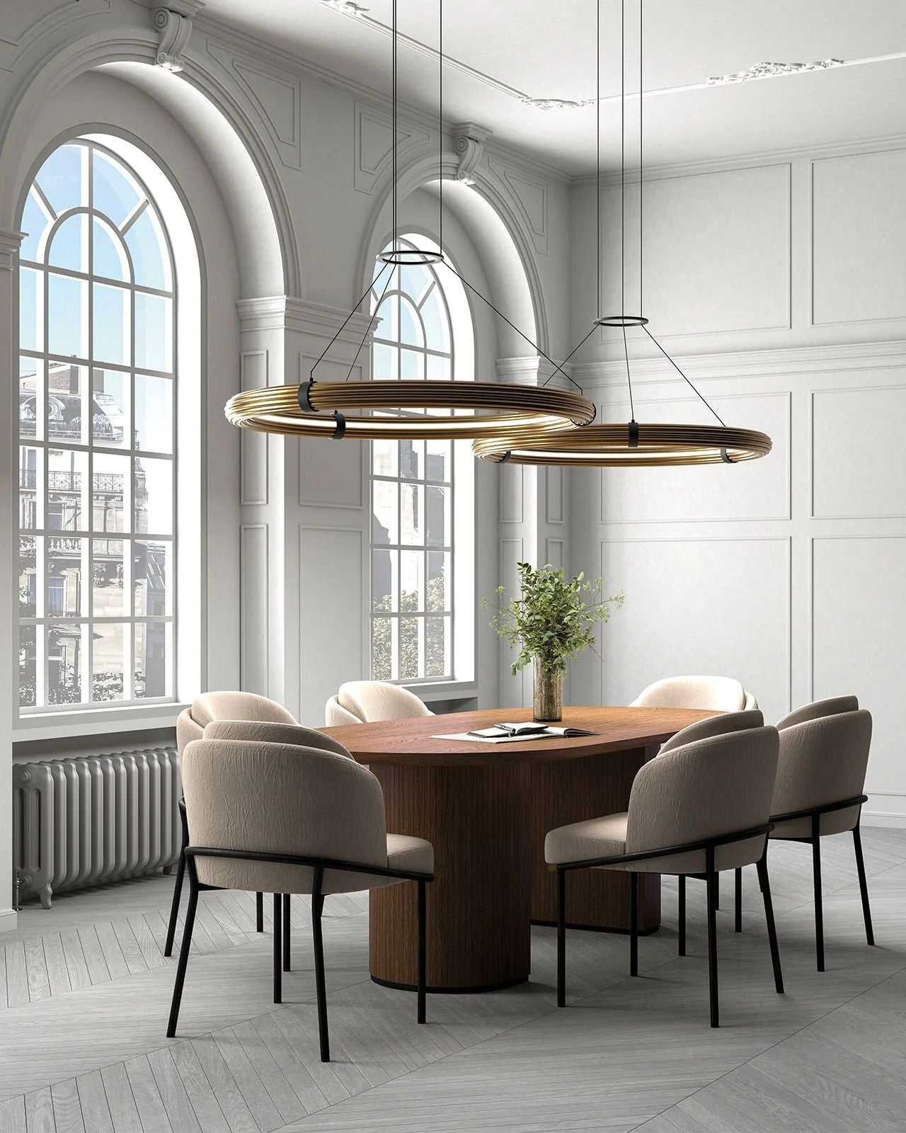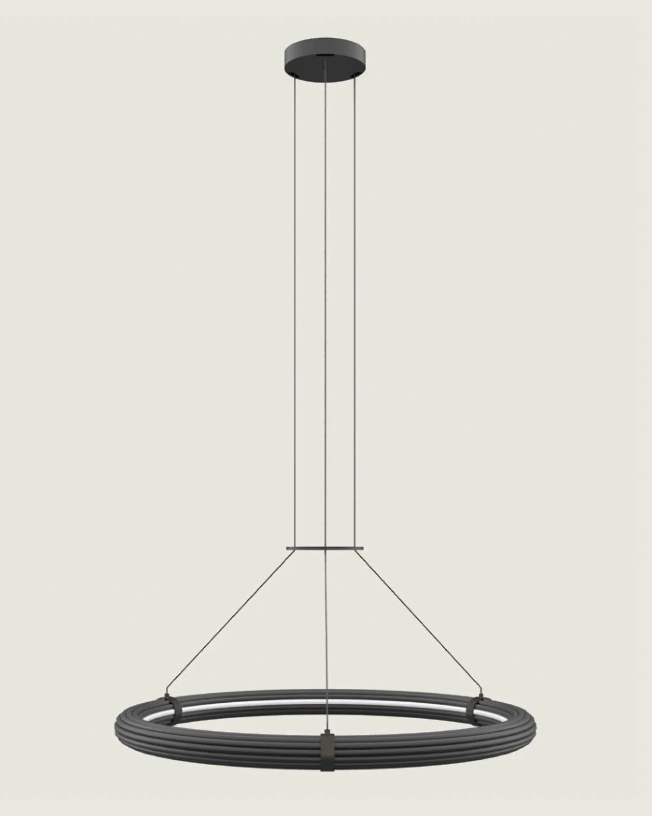 The Ribbed Circular Feature Pendant is a captivating centrepiece that blends sculptural artistry with modern lighting innovation. Its distinctive form features a series of oversized metal circles, meticulously stacked and coiled to create a dynamic, spiral silhouette. Encased within this structure is an integrated acrylic LED light, emitting a soft, ambient glow that enhances the pendant's architectural presence.