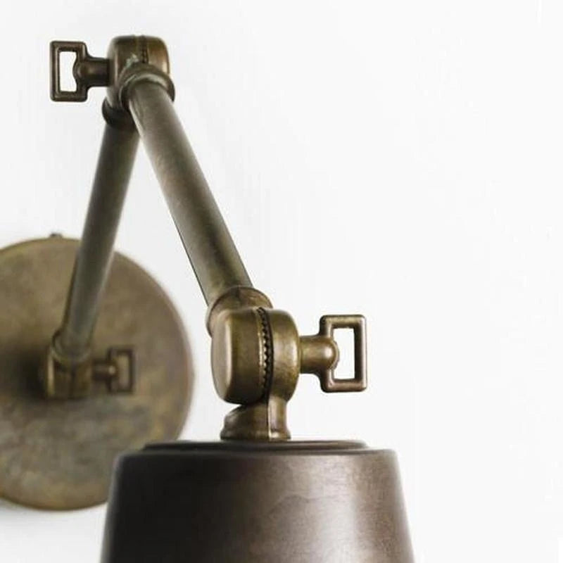 Constructed from solid brass and iron using traditional artisan techniques, this unique wall light will last the test of time. The arm of this wall light features adjustable industrial style joints which allow you to position light to suit your needs, making this a great choice for task lighting.