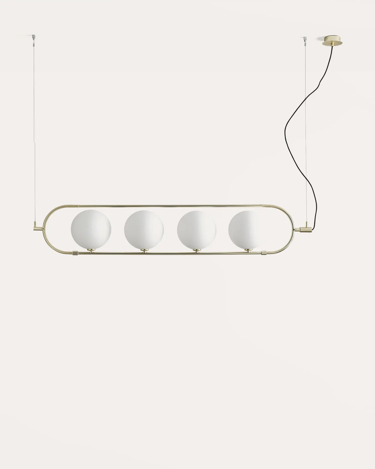 Reminiscent of a counting abacus this design is comprised of a steel frame that encompasses four evenly spaced blown glass orb diffusers. Available in Matte Black or Matte Brass this Contemporary design is ideal for adding a unique source of illumination to above a kitchen island or dining table. Provided with four warm (2700K) G9 LED's this linear design will add an atmospheric glow to any interior.