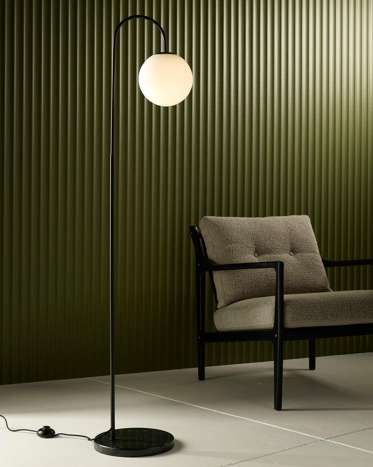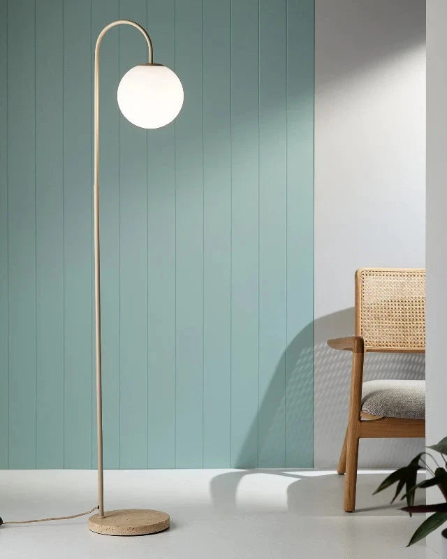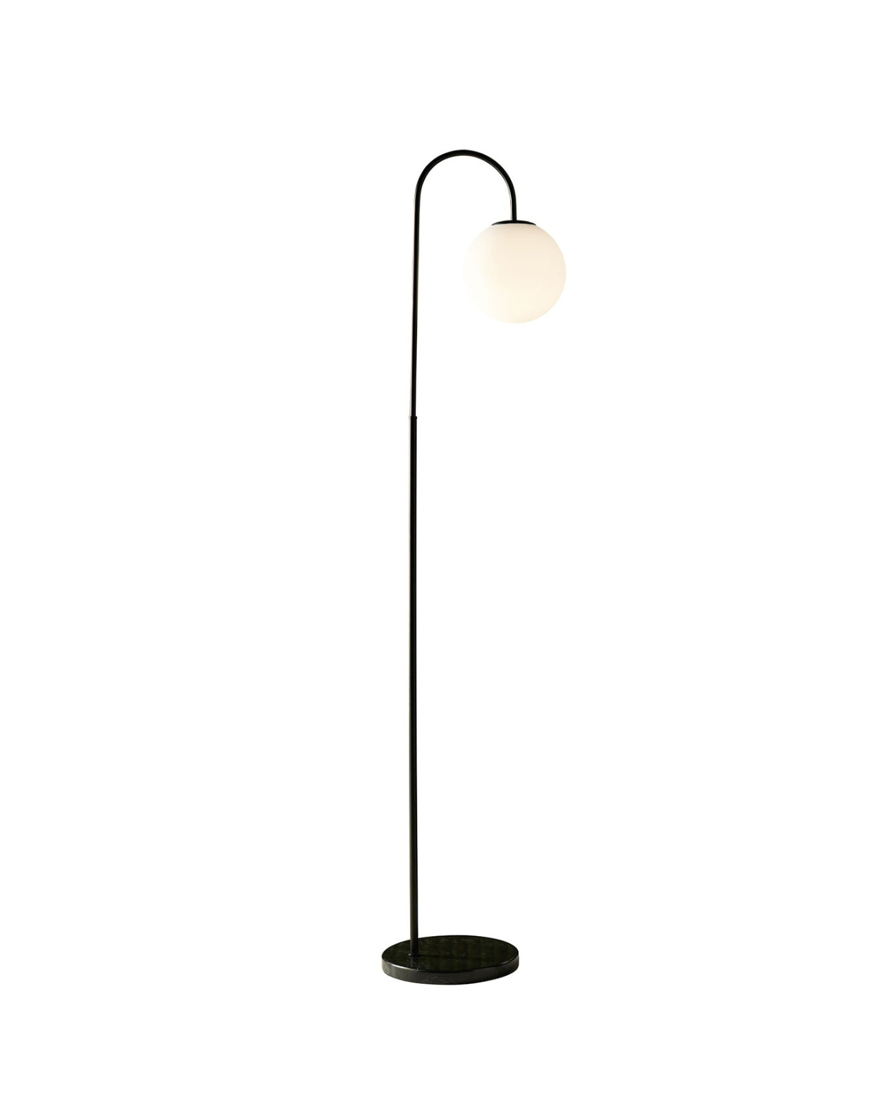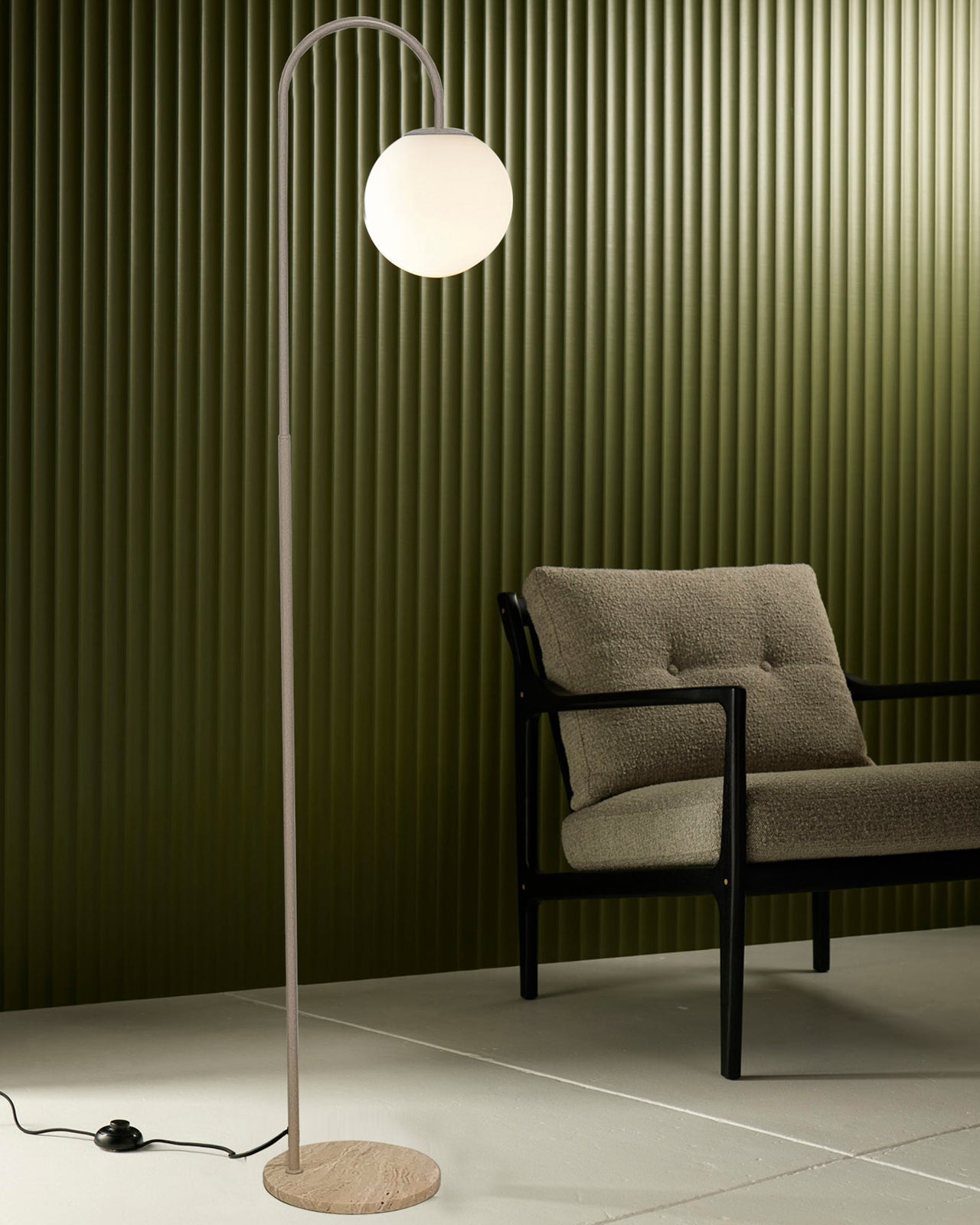 Featuring a curved metal frame and travertine base this floor lamp celebrates contemporary design. Its travertine material gives this light a terrestrial touch to enhance interior spaces. Paired with a frosted orb shade this lamp will add soft diffused light to living areas and bedrooms. Featuring a foot-on/off switch this floor lamp is to be paired with an E27 globe (not included).
