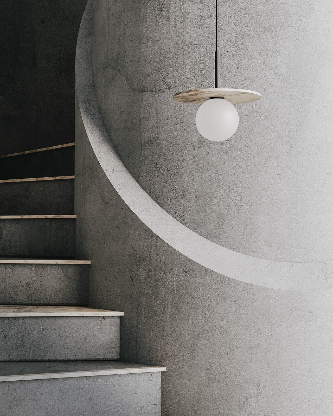 Modern pendant light hanging from a concrete ceiling with stairs in the background