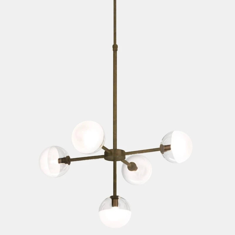 This brass five light pendant brings luxury and mid-century style to any interior space. To be paired with a five G9 LED's that our housed within half-frosted glass diffuser providing Finished in either Natural or Pre-Aged Brass this fitting is suited for single or grouped installation to create a stunning design statement within living areas, storefronts or bedrooms.