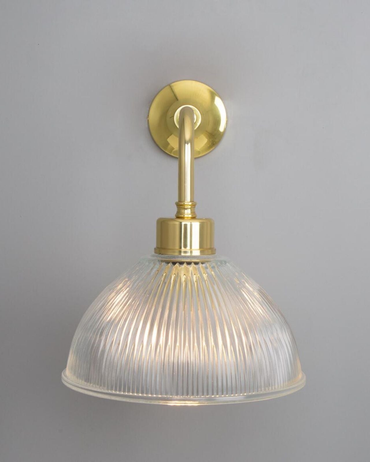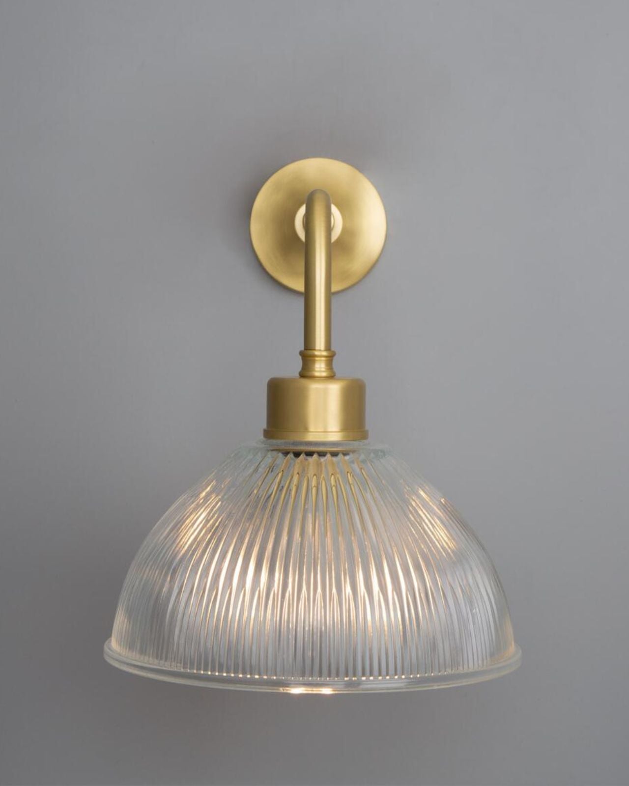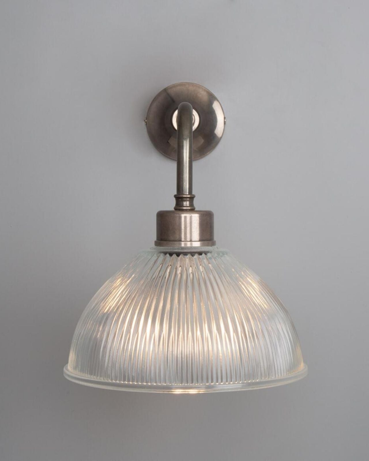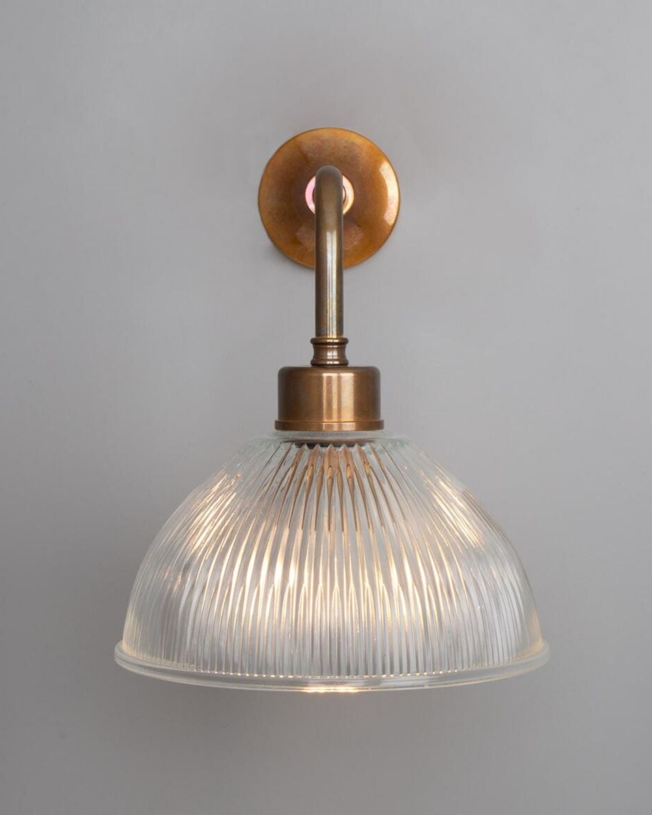 The Holophane Glass Wall Light features a classic prismatic shade paired with a simple metal arm and wall plate, blending vintage charm with functional design. Available in a variety of finishes, the industrial-inspired aesthetic is ideal for use in hallways, kitchens, or beside mirrors, where the Holophane glass perfectly diffuses light to provide an even, glare-free glow.