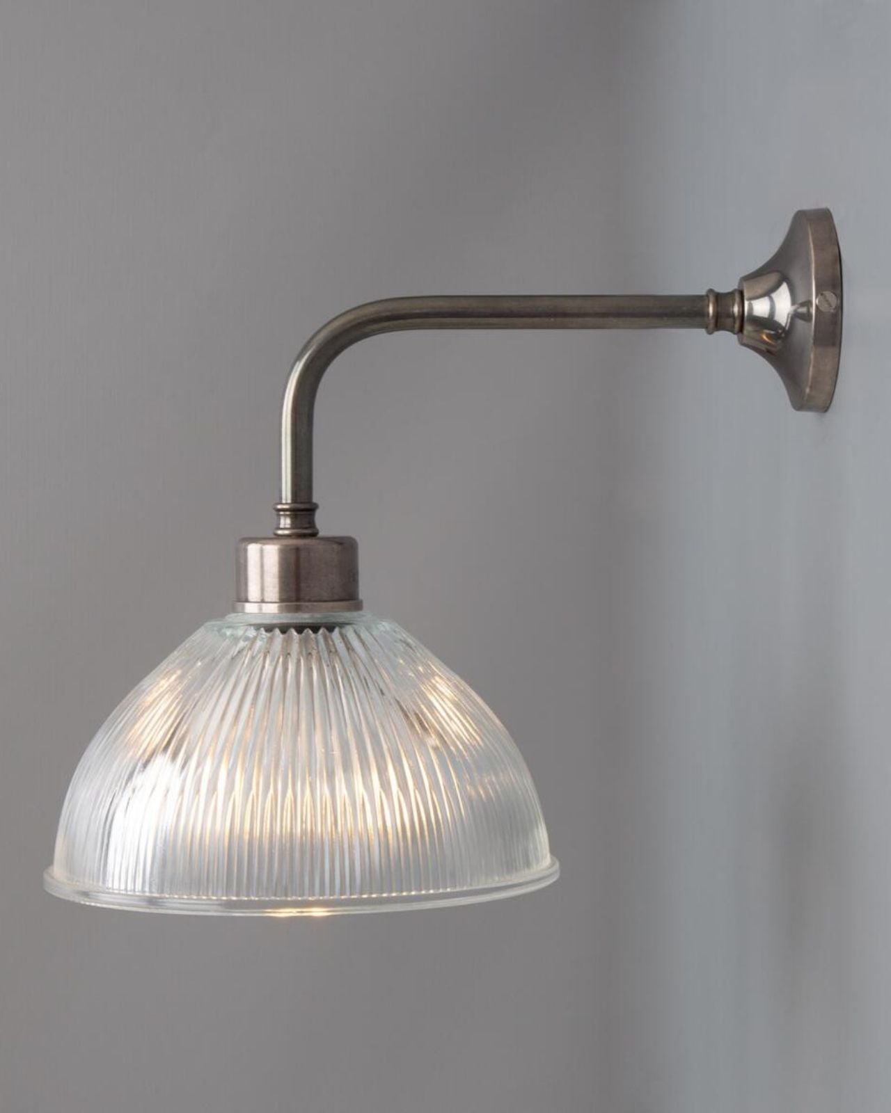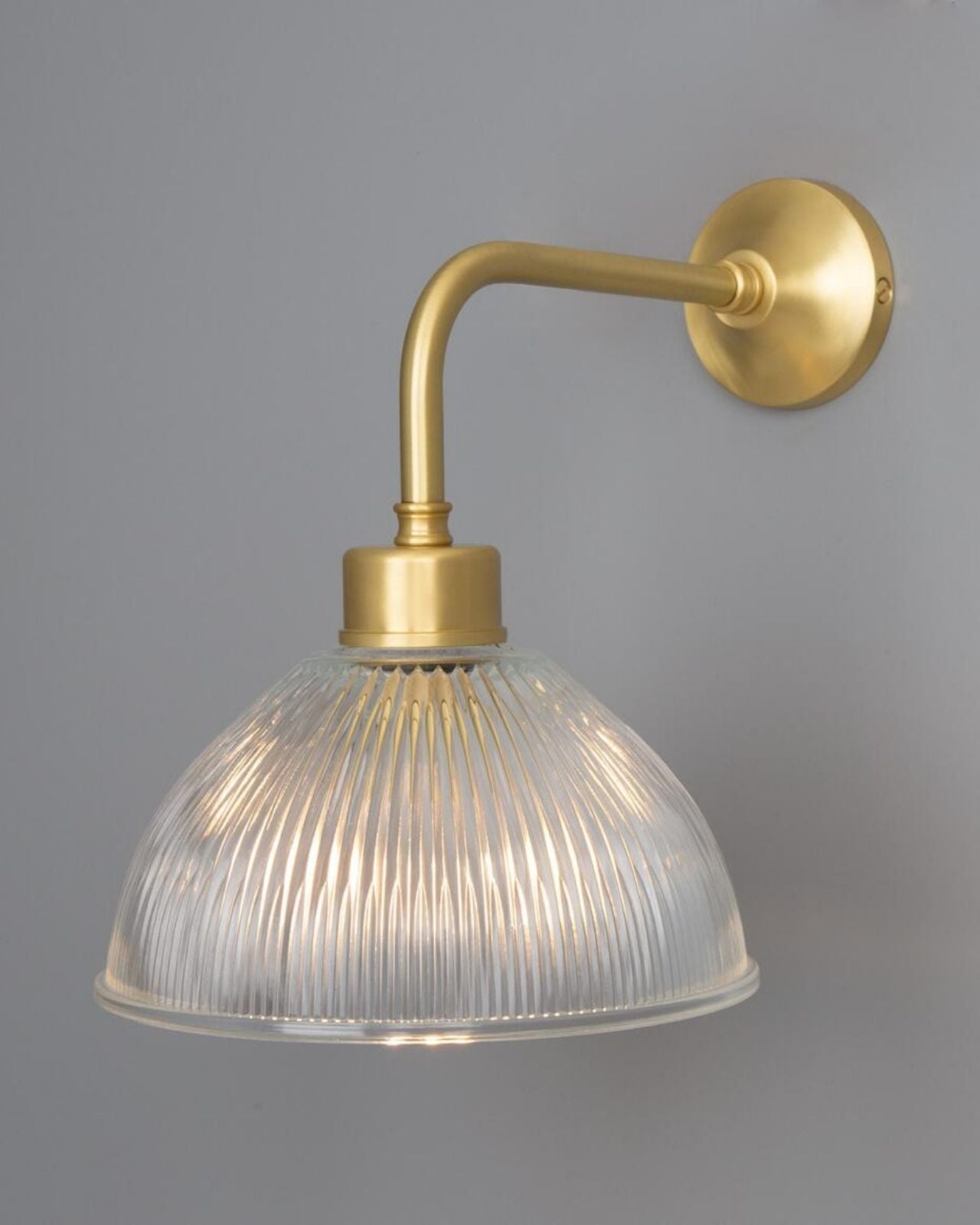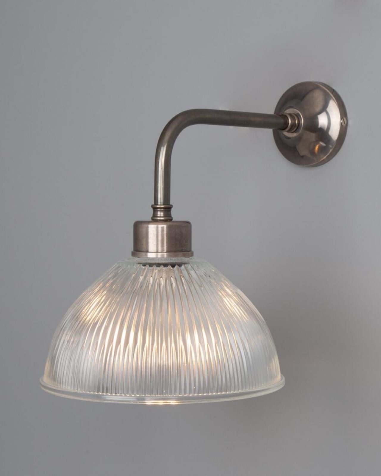 The Holophane Glass Wall Light features a classic prismatic shade paired with a simple metal arm and wall plate, blending vintage charm with functional design. Available in a variety of finishes, the industrial-inspired aesthetic is ideal for use in hallways, kitchens, or beside mirrors, where the Holophane glass perfectly diffuses light to provide an even, glare-free glow.